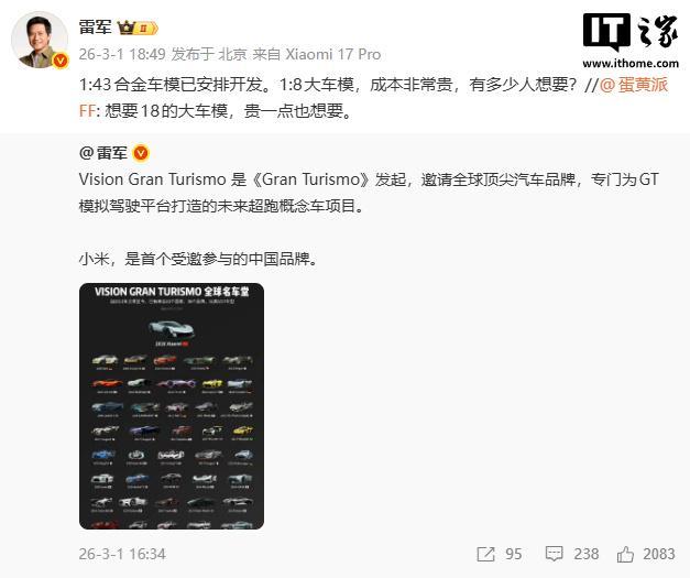 IT之家3月1日消息,小米昨晚刚发布了全新的VisionGranTurismo概念超跑,诸多小米粉丝呼吁雷军为其推出对应的汽车模型。