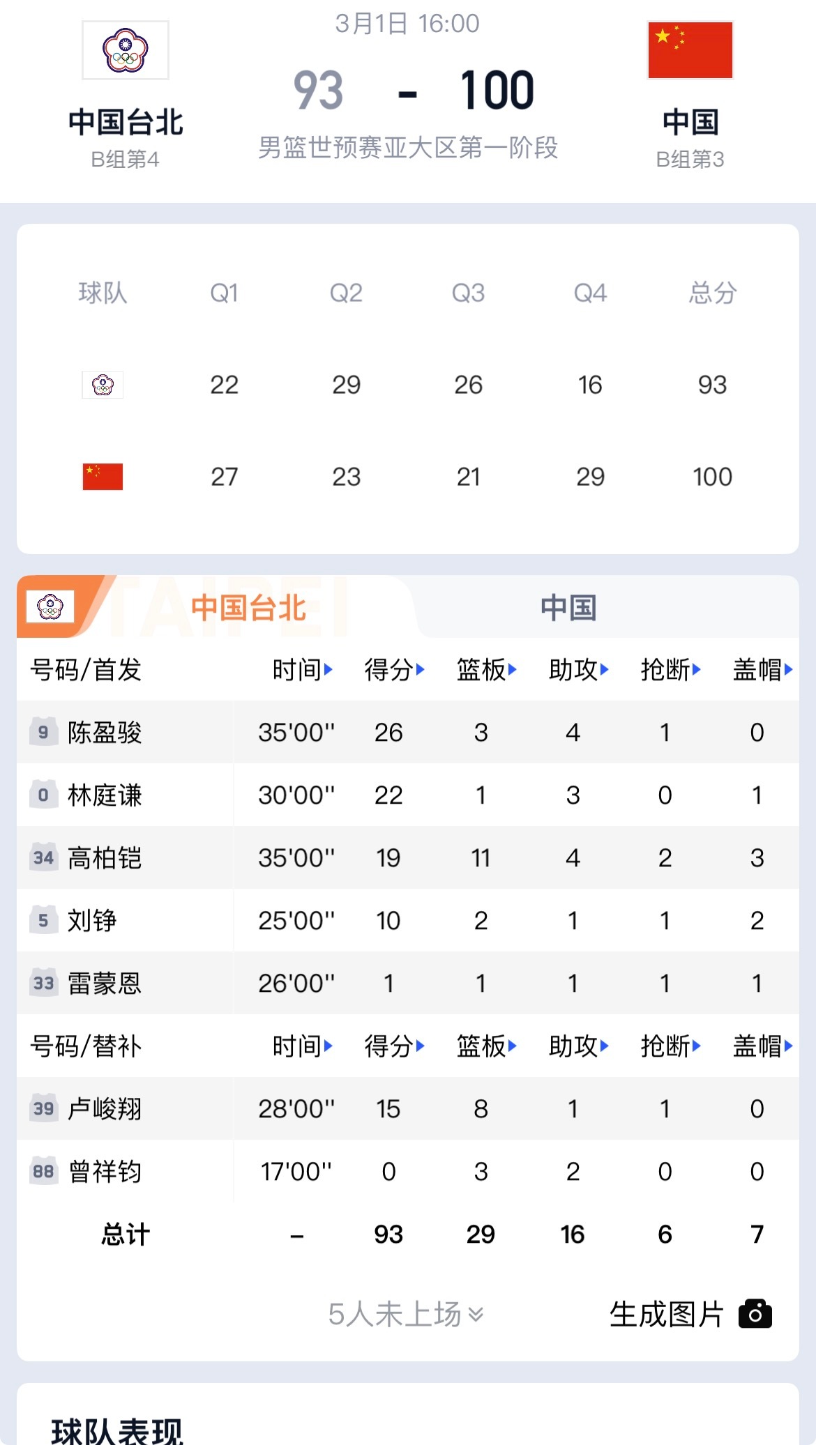 中国男篮战胜中国台北男篮太硬气!落后11分逆转台北,男篮这口气,终于喘过来了世预赛第二窗口期,中国男篮100-93逆转中国台北,两连胜收官。过程看得揪心,结果足够提气——这球,赢在心气,更赢在末节的防守与关键球。开局顺、中间崩,是男篮老毛病。首节领先5分,二三节被台北外线打穿,陈盈骏、林庭谦轮番发难,最多落后11分,节奏全在对手手里。外线防不住、内线站不住,进攻犹豫、传球拖沓,看得人直跺脚。转折点在第四节。中国男篮把防守强度拉满,全场紧逼+换防延误,掐断台北传导,逼出失误与仓促出手。赵继伟那记超远三分扳平91-91,是全队反扑的缩影;赵睿造犯规罚球反超,胡金秋连续关键篮板+罚球锁胜局,硬解能力回来了。朱俊龙19分稳定输出,胡金秋内线高效,赵继伟、赵睿双后卫撑住后场,五人上双,靠团队拼下胜利。赢球不完美:防守漏洞、失误偏多、开局慢热,问题还在。但绝境不崩盘、落后敢反扑,这股硬气,比大胜更珍贵。两连胜稳住出线形势,更重要的是找回赢球习惯与抗压韧性。亚洲赛场无弱旅,硬仗还在后头。先把这口气稳住,把防守与关键球练扎实,男篮才算真正走在正轨上。男篮世预赛