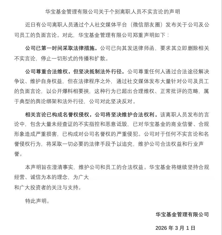 该公司表示,相关言论已构成名誉权侵权,公司将坚决维护合法权利。该离职人员发布的言论中,包含大量未经查证的不实指控和恶意诋毁,已对华宝基金的商业信誉、合规形象造成严重损害,已构成对公司名誉权的严重侵犯。公司对于任何不实言论和名誉侵权行为,将采取一切必要的法律手段予以追究,维护公司合法权益和行业声誉。
