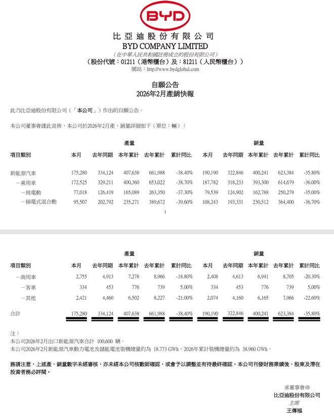 3月1日消息,比亚迪今日发布2026年2月产销快报:当月新能源汽车销量为190,190辆,同比下滑35.8%;其中乘用车销量187,782辆,同比下降36.0%。纯电车型销售79,539辆,同比下滑35.00%,插电式混动车型销售108,243辆,同比下滑36.7%,整体表现受春节假期及行业竞争加剧影响明显。