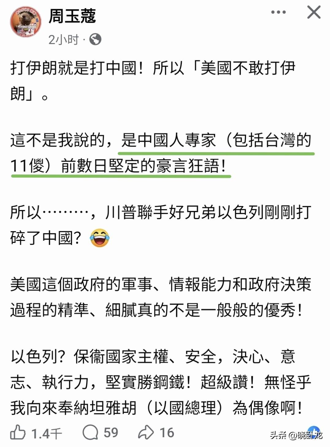 周玉蔻:包括台湾“11傻”说打伊朗就是“打中国”。 岛内绿营资深媒体人周玉蔻今天(3月1号)在社交媒体发表奇葩论述,也不知道她从哪里打听到的消息,说中国人专家(包含中国台湾11个事实评论员)几天前认为老美不敢打伊朗,因为打伊朗就是打咱们。 周玉蔻意思是那些专家、时事评论员现在被“打脸了”,因为美以对伊朗开打了,她就开始嘲讽专家们。 另外,这个周玉蔻和其他岛内青鸟、绿营侧翼网军名嘴们一样,都在那里欢呼雀跃,仿佛是他们打赢了一样,周玉蔻甚至在文中大大夸奖美以的决心、意志和执行力,还称纳坦雅胡是她的偶像。 这里解释一下,周玉蔻提到的“11傻”是绿营媒体和网军给中天那10位比较客观理性分析的事实评论员加唐湘龙起的外号,11人分别是:周锡玮、郭正亮、帅化民、介文汲、赖岳谦、谢寒冰、栗正杰、杨永明、吕礼诗、苑举正和唐湘龙。 这11位评论员的观点经常和绿营不同,预测和分析水准对比绿营名嘴更准确更靠谱,又有着较强的专业素养,这引起绿营媒体的嫉妒,所以给人家起外号叫“11傻”进行报复,只有傻子才会叫别人傻子,这个道理懂得都懂。 而事实上压根没有看到有什么专家和中天节目的评论员说“打伊朗就是打中国”这样的话,这种荒唐、奇葩论述大多数都是绿营媒体人自导自演,要么就是把某位专家、蓝营评论员的话进行断章取义,截取一段放大反向解读,例如别人可能只是提供一个他的假设性看法,绿营周玉蔻这样的媒体人就解读为另外一种意思。 最后我提醒周玉蔻等绿营媒体人、电视名嘴们,现在不要在那边高兴狂欢,看看蔡正元的文章分析吧,将来你们这些“独派”有可能会被狠揍。