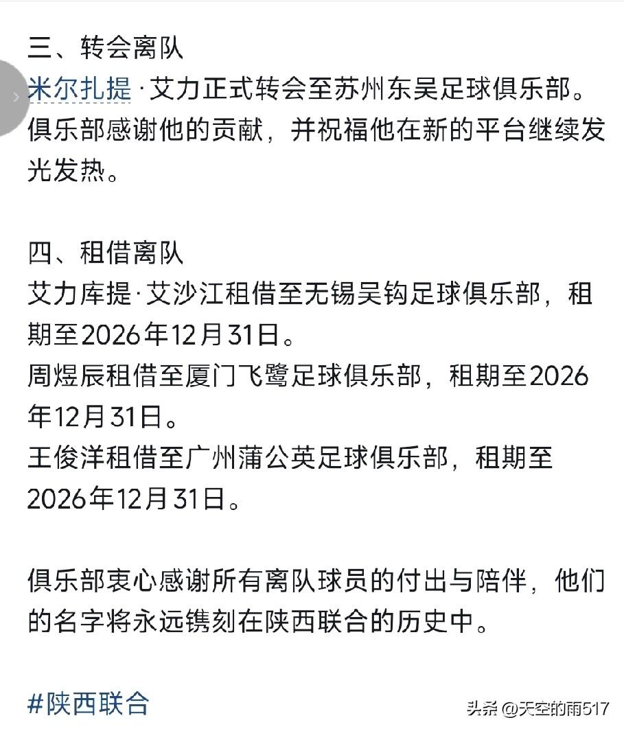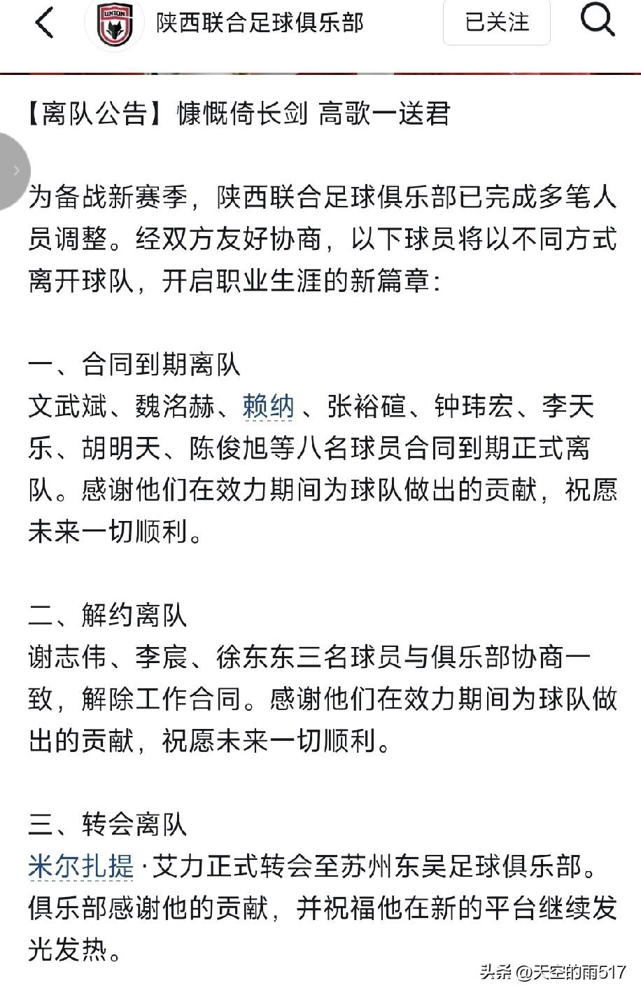一支球队就是一个营盘,铁打的营盘流水的兵,有来的就有离开的,陕西联合俱乐部官方公告向这些离开球队的球员感谢并祝福。 合同到期的离队球员有八名,文武斌、魏洺赫、赖纳、张裕碹、钟伟宏、李天乐、胡明天、陈俊旭解约离队。解约离队的三人谢志伟、李宸、徐东东、和球队协商解约。 转会一人,米尔扎提去苏州东吴,租借三人,艾力库提、租借无锡无钩俱乐部,周煜晨租借厦门飞鹭俱乐部,王俊洋租借广州蒲公英俱乐部。 感谢所有的球员,你们为陕西足球的付出和贡献,他们的名字永远篆刻在陕西联合的历史中,和陕西球迷的心中!祝福你们在别的球队,再现辉煌时刻,在绿茵场上驰骋。