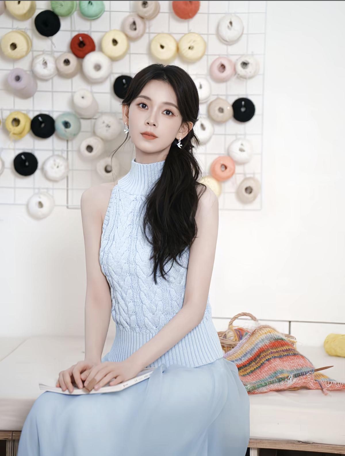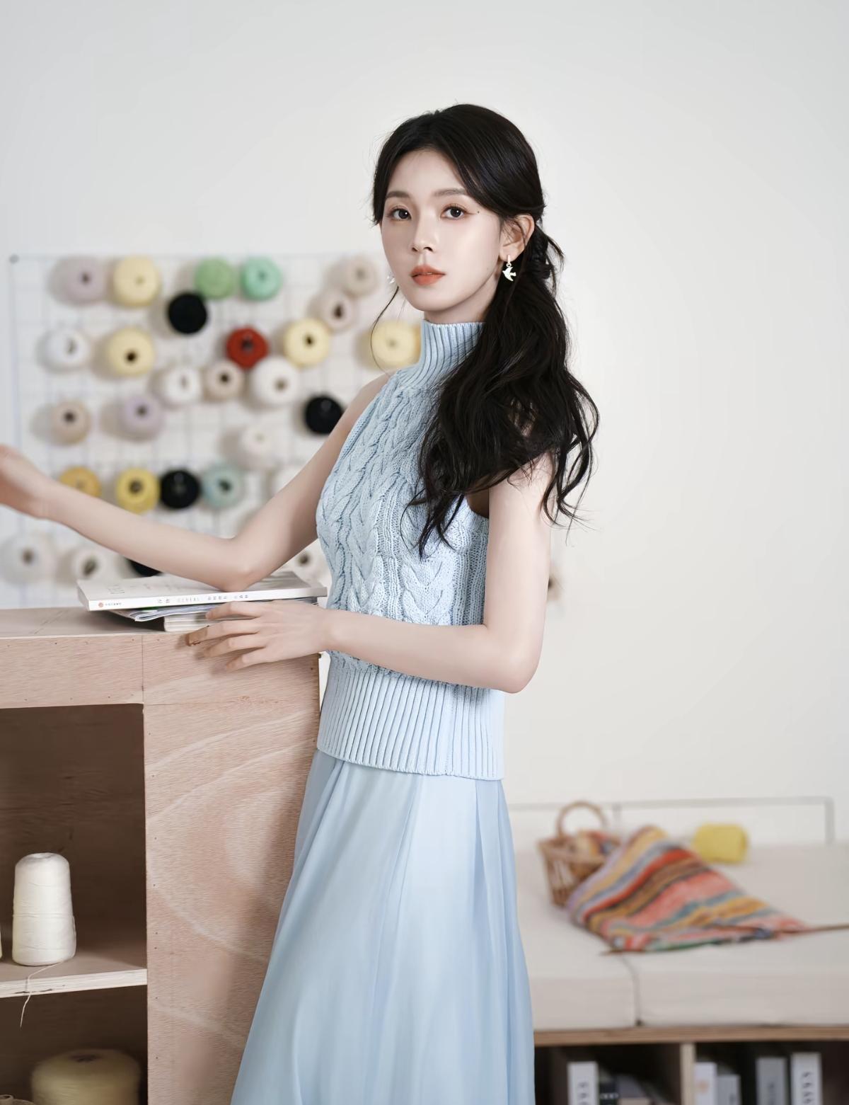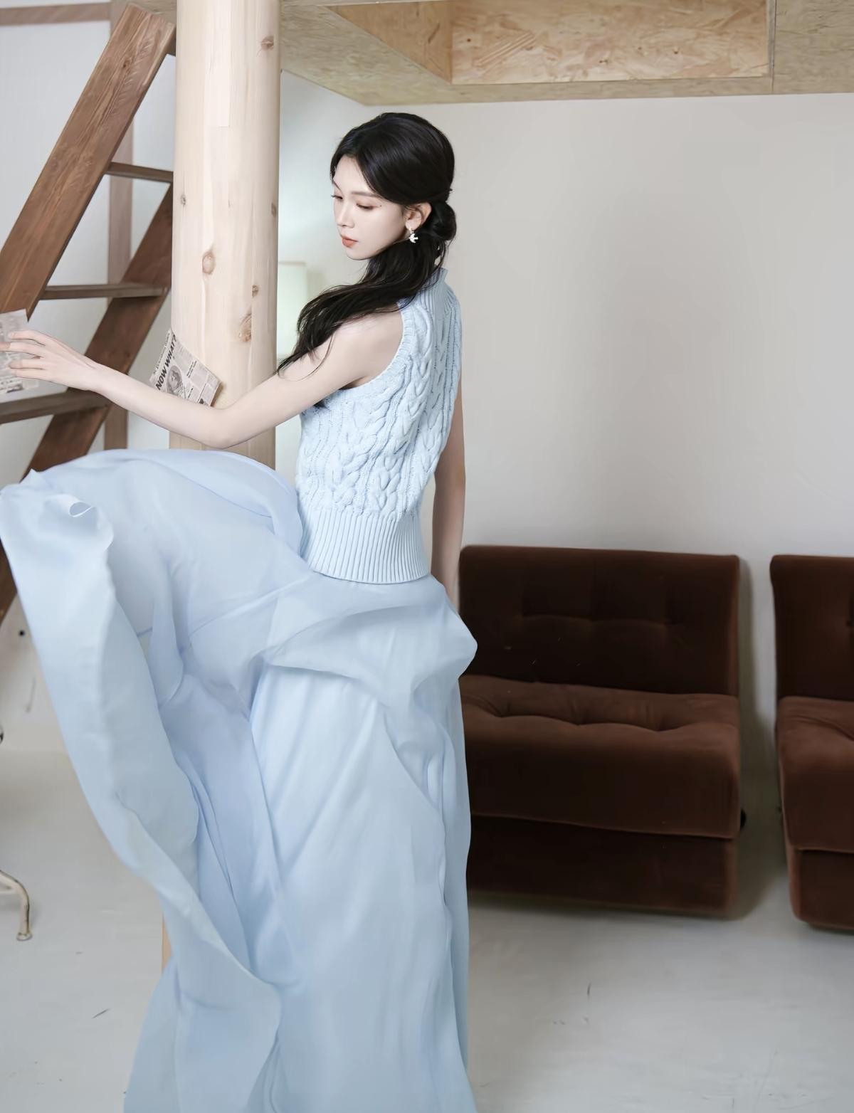 浅蓝挂脖针织衫+垂坠纱裙,陈瑶这组写真把清冷感和少女感平衡得刚刚好[给力][比心