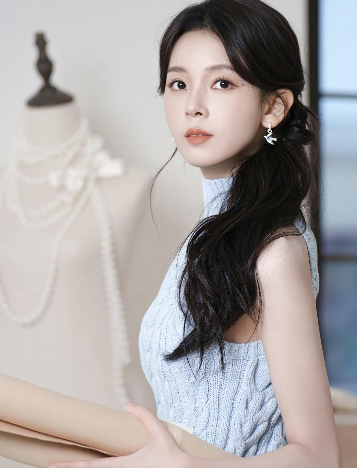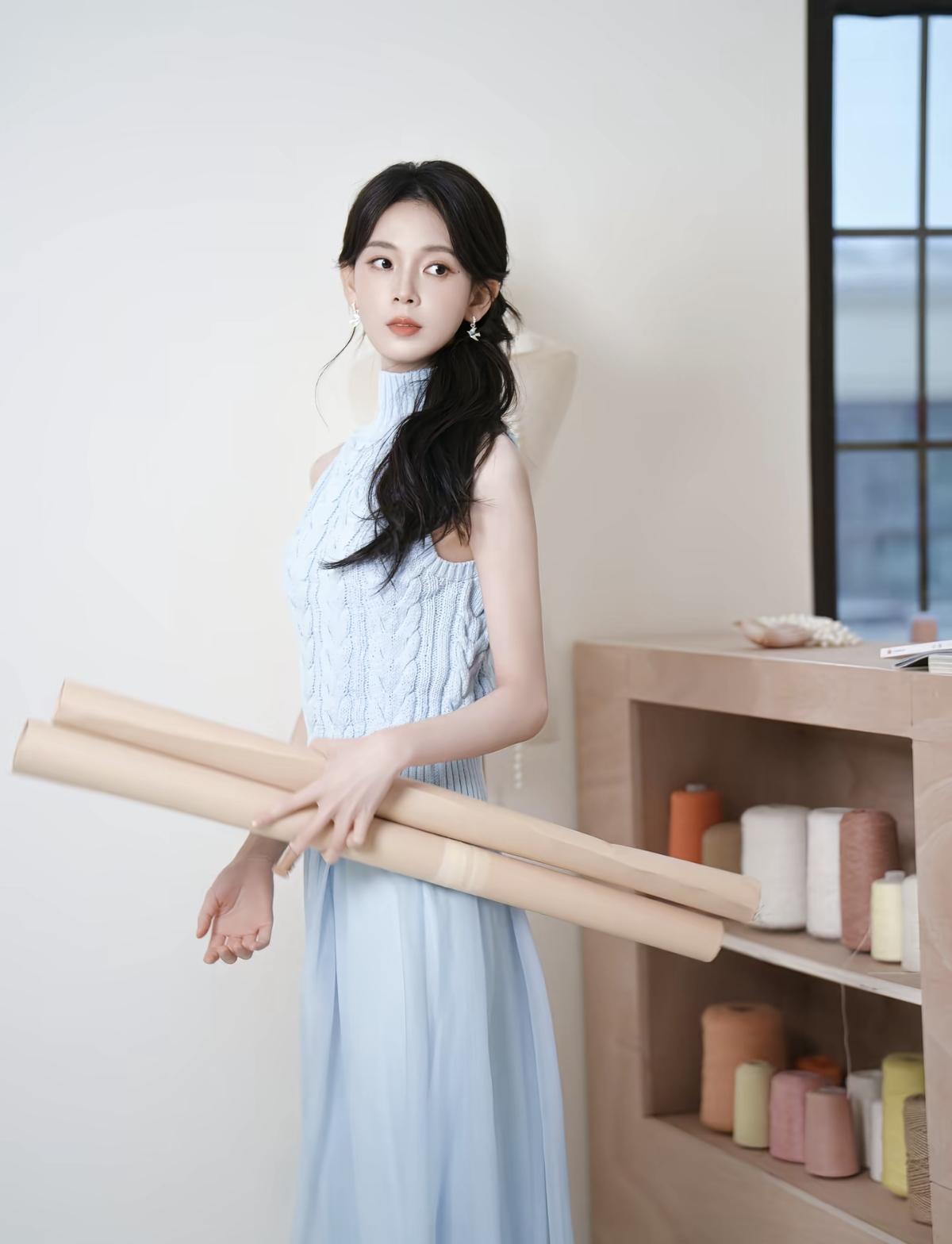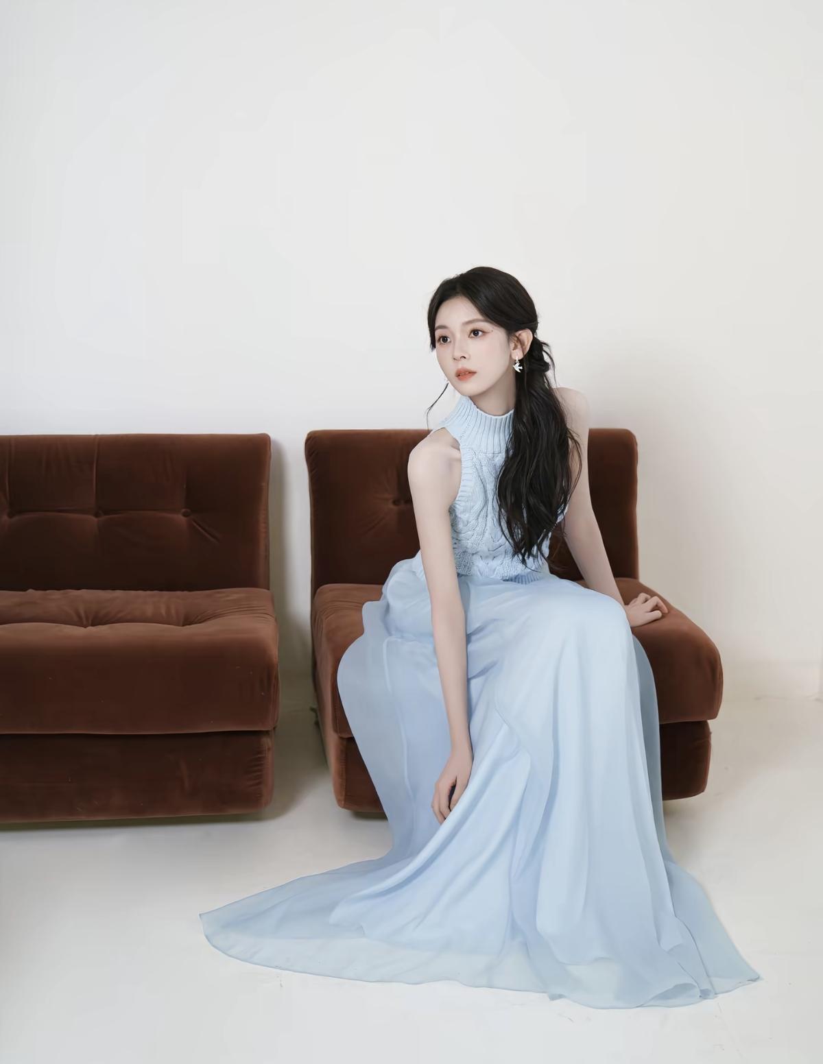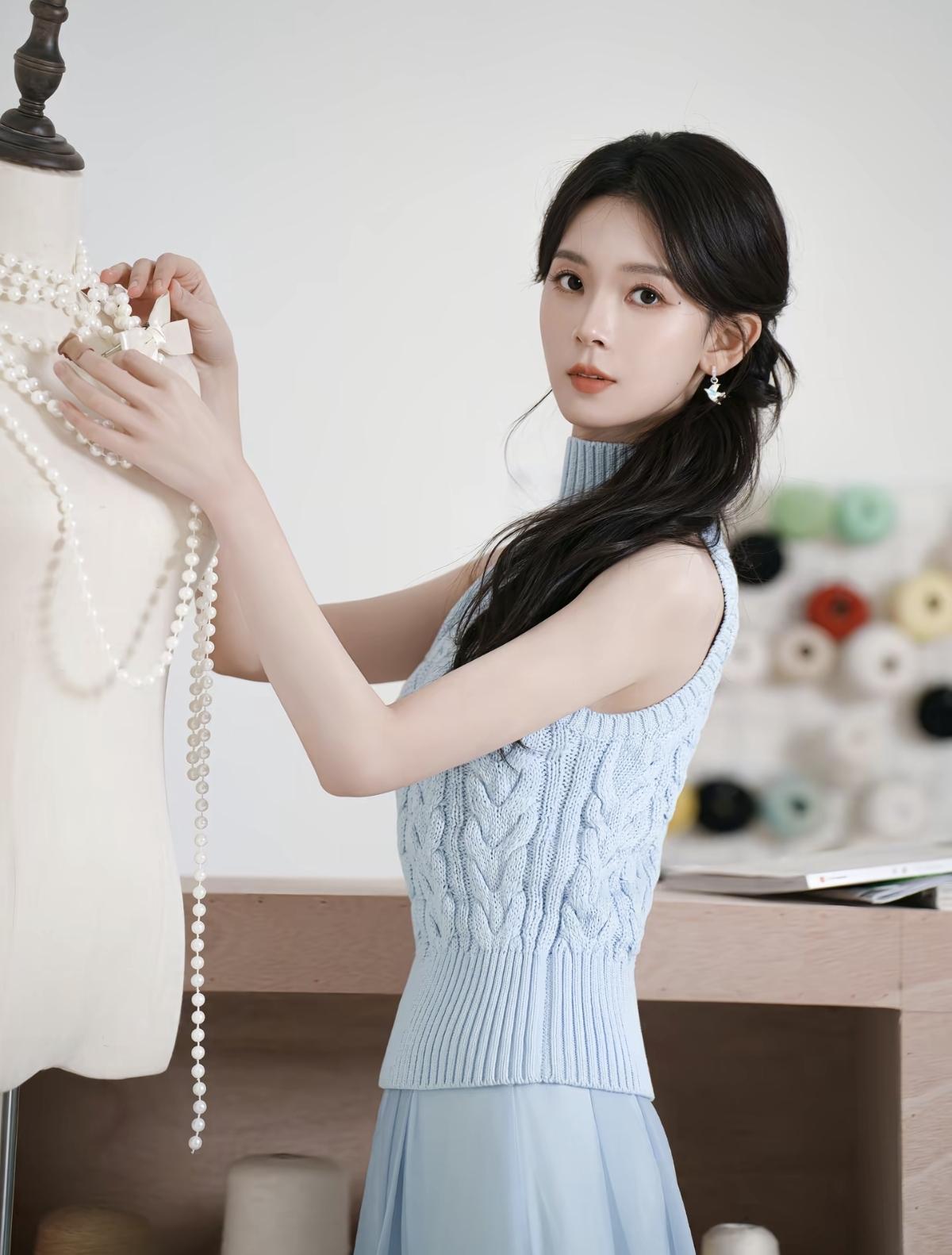 浅蓝挂脖针织衫+垂坠纱裙,陈瑶这组写真把清冷感和少女感平衡得刚刚好[给力][比心