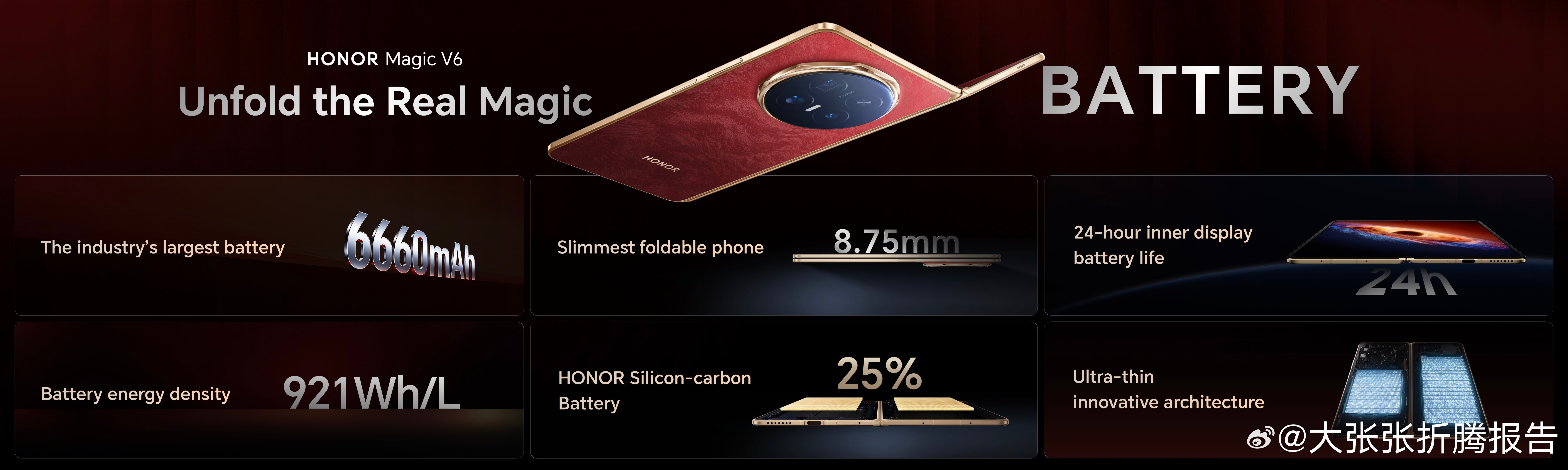 荣耀MagicV6折叠屏轻薄纪录保持者 MWC2026首发亮相的最新一代折叠旗舰荣耀Magic V6 ,以折叠态8.75mm的极致轻薄机身,再次刷新行业折叠屏轻薄纪录,这也是荣耀三年内第四次打破自己保持的轻薄纪录。新一代青海湖刀片电池,首次将折叠屏电量提升至7000m+Ah以上,同时以32%最高硅含量、0.15mm最薄叠层厚度、985Wh/L最高能量密度,一举打破四项行业纪录。凭借一系列突破,荣耀青海湖电池技术已持续领先行业两代。荣耀Magic V6实现了轻薄、续航、屏幕、可靠、性能/影像、体验六大满贯的全面跨越。它不仅终结了“轻薄必妥协”的行业旧规,更以全方位创新实力,树立起折叠旗舰的新标杆。荣耀发布会