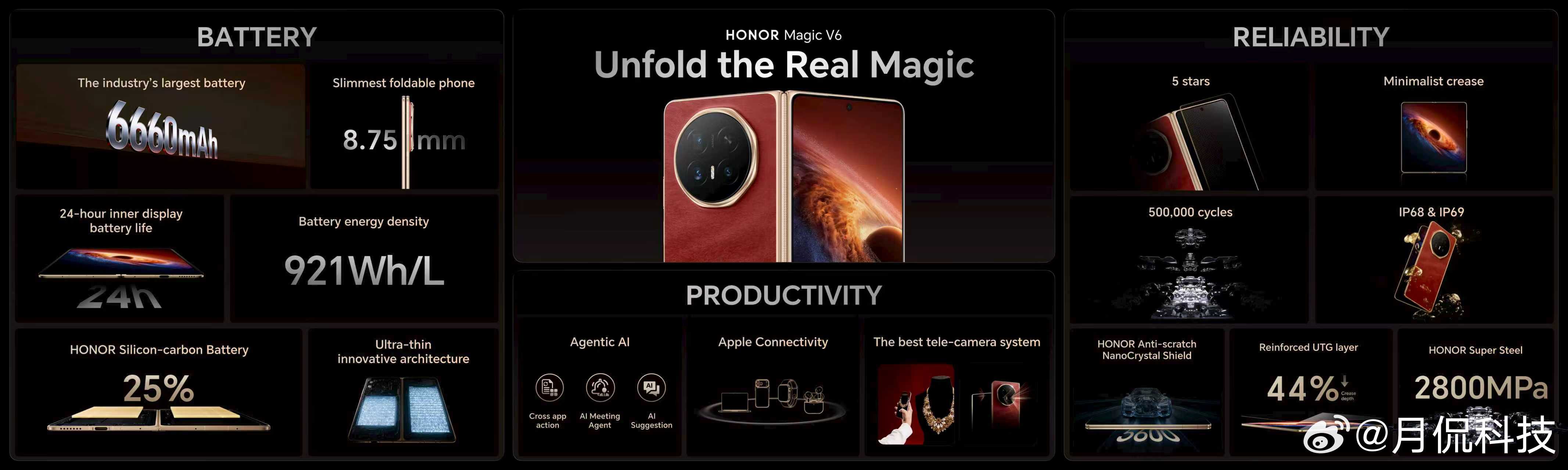 MWC2026亮相的荣耀Magic V6,折叠态仅8.75mm,再刷折叠屏轻薄纪录,荣耀三年内第四次自我突破!新一代青海湖刀片电池,把折叠屏电量冲上7000mAh+,一举打破四项行业纪录,电池技术领先行业两代。轻薄、续航、屏幕、可靠、性能、影像全面拉满,终结“轻薄必妥协”,重新定义折叠旗舰标杆。荣耀MagicV6折叠屏轻薄纪录保持者荣耀发布会