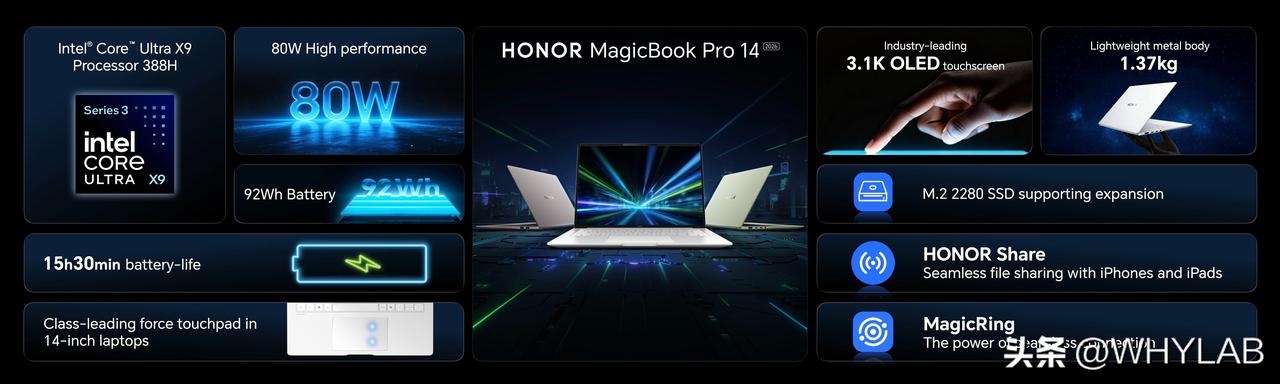 荣耀 MagicPad 4 和 MagicBook Pro 14 2026 款全球版发布: MagicPad 4 搭载骁龙 8 Gen 5 处理器,165Hz OLED 屏幕(边框 3.9mm),11000mAh 电池,八扬声器,厚 4.8mm; MagicBook Pro 14 2026 款搭载英特尔酷睿 Ultra X9 388H 处理器,80W 性能释放,3.1K 14 英寸 OLED 屏幕,92Wh 电池,压感触控板,重 1.37kg。