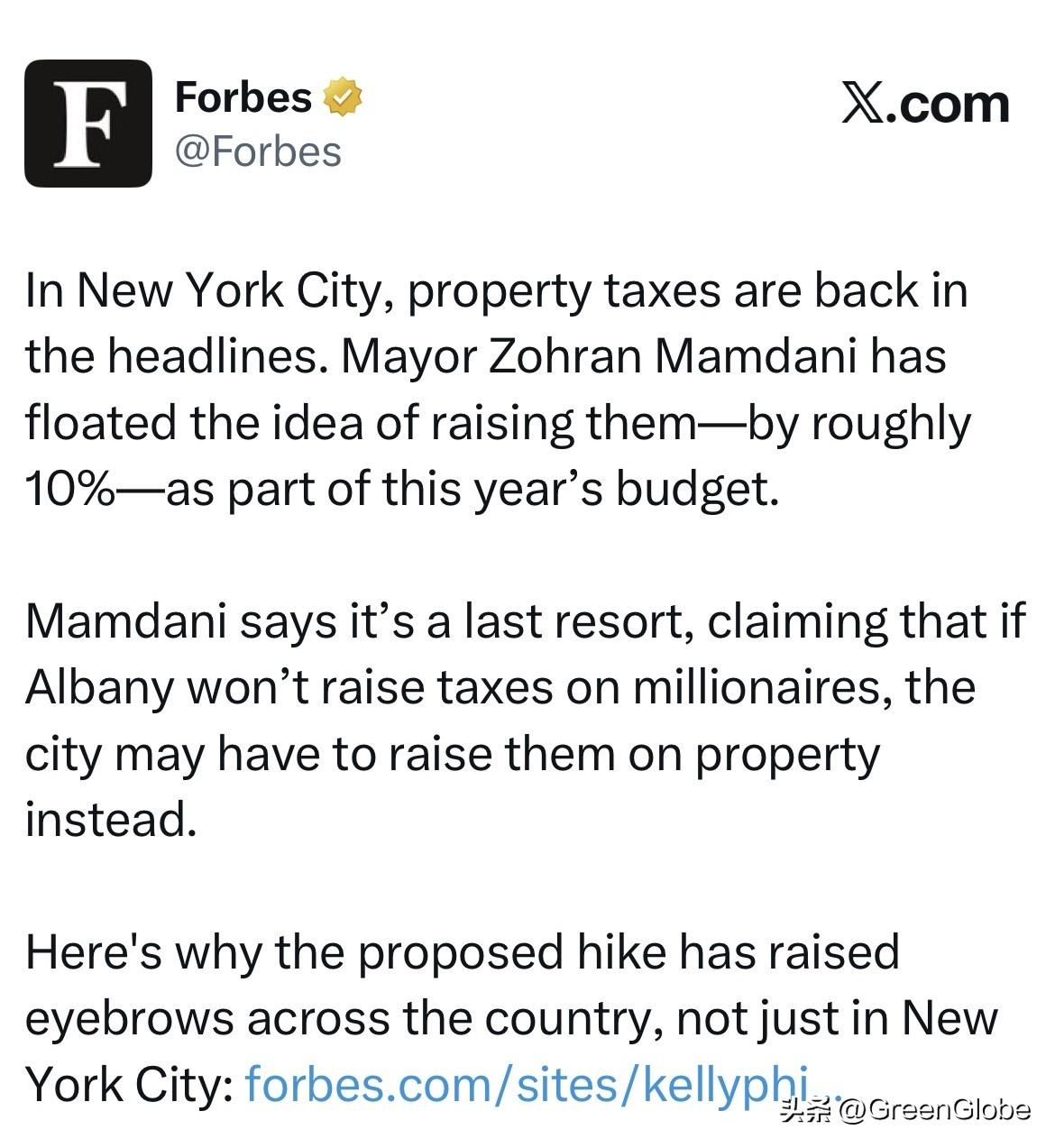 《福布斯》杂志报道:在纽约市,房屋财产税再次成为头条新闻。 纽约市新任市长佐兰·曼丹尼/Zohran Mamdani最近提出了将他们提高约10%的想法,作为今年预算的一部分。 佐兰·曼丹尼表示,提高房屋财产税这是最后的手段,他表示如果纽约州政府再不决定提高对百万富翁的收入税收,纽约市可能不得不被迫提高房屋财产税。 这就是为什么纽约市提出的房屋财产税增加,在全国各地引起了众多屋主们的注意,也激起了大量的反对意见,而这些反应不仅仅是在纽约市,已经遍及整个美国。 与此同时,佛罗里达州也在推进取消房产税的法案。这对于纽约市增加房产税的提案而言,简直是灾难性的冲击。