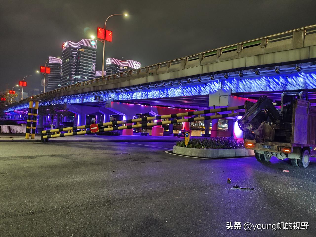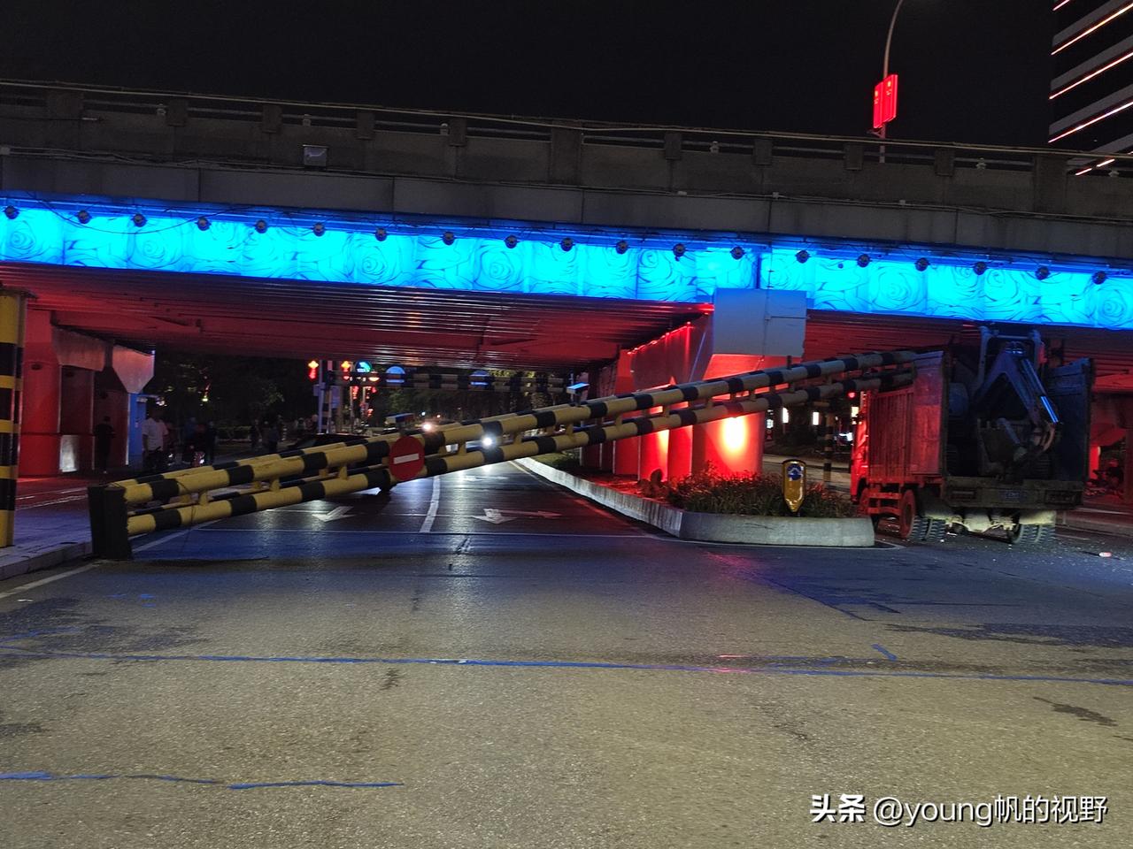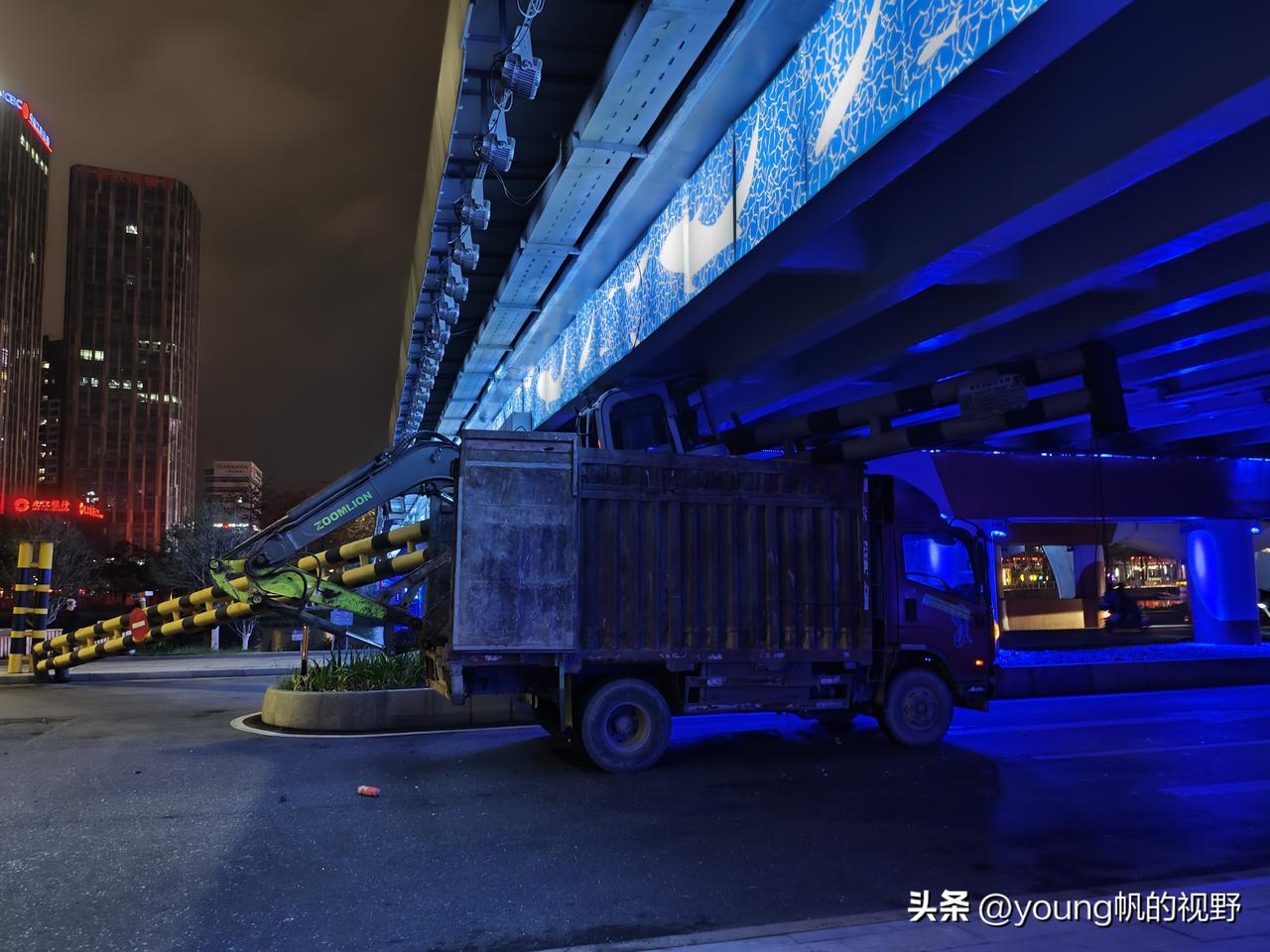 广州南沙,一名货车司机拉着小型挖掘机行驶在蕉门河旁的道路上,可能是尾注意到前方进港大道桥的限高杆,结果挖掘机与限高杆发生了碰撞,导致限高杆倒下横卧在了对向车道上,造成了道路通行受阻。