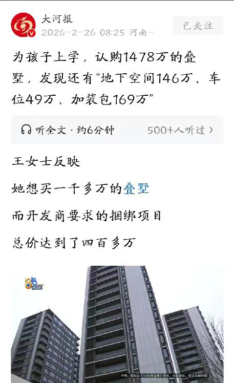 吃相太难看!2月26日,浙江杭州,女子为了孩子上学,花1478万买了套叠墅,谁知,付了5万块定金之后,销售竟然告诉她,想要办贷款,还要额外购买146万的地下室,两个49万的车位,还有169万的加装包,杂七杂八要400多万。女子顿时懵了,她用不上这些,便干脆不办贷款,准备全款买房,没想到,竟遭到开发商拒绝。更绝的是,开发商还直接将她告上法庭,要没收她5万定金。 这件事被曝光后,全网都在替这位女士打抱不平,说到底,她买这套千万叠墅,根本不是为了炫富,而是为了给孩子争一个上学的资格。 据了解,这位女士是山东人,为了让孩子能在杭州接受更好的教育,她和家人在杭州摇号摇了整整两年,才终于拿到了这套拱墅区叠墅的购房资格,本来以为终于能了却一桩心愿,没成想,却掉进了开发商挖好的陷阱里。 可能有人会说,能花1478万买叠墅的人,也不差这400多万,但大家忽略了一个关键——这些附加的东西,她根本用不上。 女子自己不会开车,两个49万的车位对她来说就是摆设;146万的地下室,销售说是消防通道,买了才能打通楼梯当储藏室,不买就会被锁门,回家要绕一大圈,可她实地核实后发现,一楼有正常入口,所谓的“回不了家”纯属销售的恐吓。 更离谱的是那个169万的加装包,里面所谓的高端家具,一个沙发就敢标价40万,一台冰箱20万,价格比市场上同类产品高出好几倍,而且销售明确说,价格不能谈,不买就不给办贷款。 女子当时就懵了,她付定金之前,销售半个字都没提这些附加条件,等到5万块定金交出去,生米煮成熟饭,才把这些“霸王条款”抛出来,这明摆着就是坐地起价,趁火打劫。 女子思来想去,这些附加项目不仅用不上,还得多花400多万,实在不划算,于是干脆放弃贷款,决定凑钱全款买房。 她以为,全款买房对开发商来说是好事,不用等银行审批,能快速回笼资金,开发商肯定会同意,可万万没想到,开发商想都没想就拒绝了。 更让人愤怒的是,开发商拒绝全款后,非但没有丝毫歉意,反而倒打一耙,直接把女子告上了法庭,理由是“女子未按规定办理后续购房手续”,要求法院判决没收她那5万块定金,还要解除她的购房资格。 这操作简直刷新了底线,明明是自己强制捆绑销售,不合理在先,却反过来起诉购房者,属实是店大欺客到了极点。 可能很多人会疑惑,开发商这么做,难道不违法吗?答案是肯定的。根据住建部2016年下发的通知,明确禁止开发商以捆绑搭售、附加条件等方式,迫使购房人接受商品或服务价格,这属于不正当经营行为。 而且《消费者权益保护法》也明确规定,消费者享有自主选择商品的权利,开发商这种强制捆绑的做法,已经侵犯了女子的自主选择权。 更关键的是,最高人民法院关于商品房买卖合同的相关解释里明确说明,因当事人一方原因未能订立商品房买卖合同的,才按定金规定处理;如果是不可归责于双方的事由,开发商应当返还定金。 很明显,这次签约失败,根本不是女子的问题,而是开发商强制搭售导致的,他们根本没资格没收定金。 目前,女子已经向杭州市住保房管局投诉,相关部门也表示会依法调查处理,而开发商则回应称,此事已进入司法程序,以法院裁判结果为准。 其实这件事,不止是一个简单的购房纠纷,更暴露了房地产市场里的一些乱象——有些开发商利用购房者的迫切需求,比如学区房、购房资格等,设置隐形门槛,强制捆绑销售,赚取不义之财。 对于普通人来说,买房本身就是一件大事,尤其是为了孩子上学买房,更是倾尽所有,谁也不想遭遇这样的糟心事。 在这里也提醒大家,以后买房不管是买刚需房还是豪宅,付定金之前一定要问清楚所有费用,把各项约定都写进合同里,留存好沟通录音、聊天记录等证据,一旦遇到开发商强制捆绑销售、拒绝合理要求的情况,一定要及时维权,不要轻易妥协。 毕竟,公平交易是市场的底线,开发商再强势,也不能凌驾于法律之上。希望这起案件能得到公正判决,退还女子的定金,也希望相关部门能加大监管力度,严查这类违规销售行为,不让更多购房者再踩坑,也不让教育焦虑,成为开发商牟取暴利的工具。