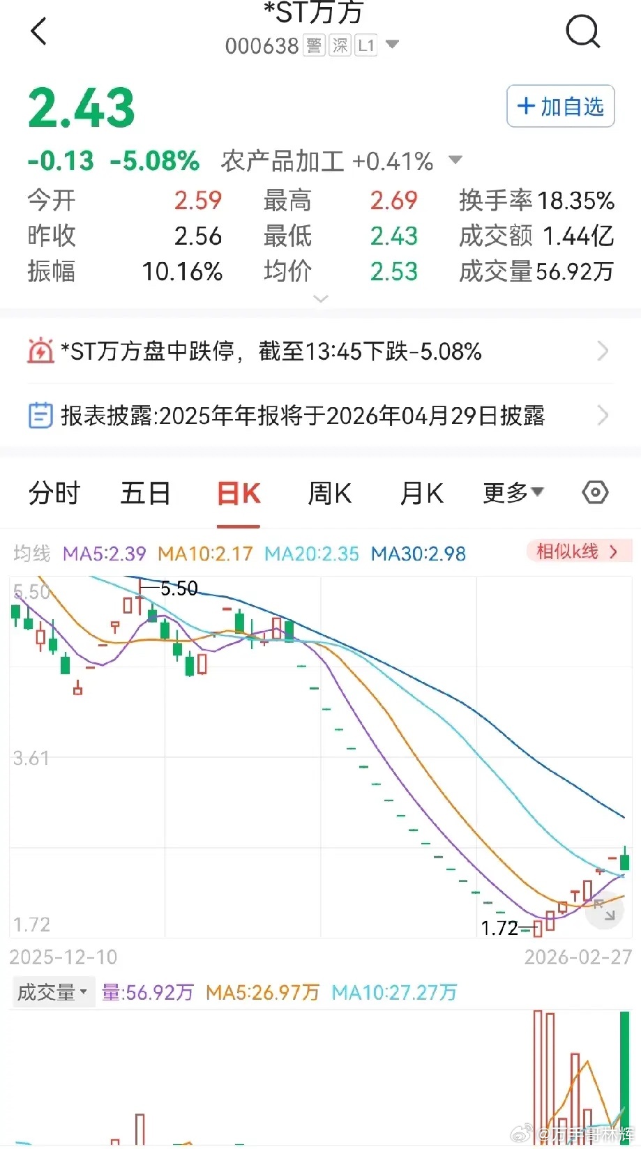 这玩意真是打不死的小强!说明A股市场不怕死的赌徒太多了,干掉一茬又一茬啊!前面抄底st奥维的人被活埋了,抄底st立方的人5天賺了3倍,如果继续贪婪没走的人就被一锅焖了,突然停牌导致人财两空!现在这个st万方又在重蹈覆辙,一周时间翻倍了,退市风险警示不断,仞然还有很多人铤而走险,刀口舔血,正所谓富贵险中求,有人不惜血本抄底博一把,想一夜暴富,这就是赌运气,目前还没有停牌退市,说不定哪天突然就停牌了,那所有进场的赌徒又被闷杀了!