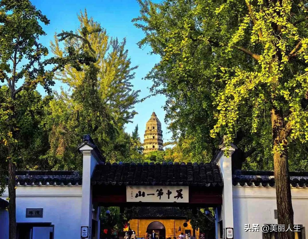 先见虎丘塔,后见苏州城。苏州云岩寺塔为八角七层仿木结构阁楼式砖身木檐塔,是江南现存最古老的砖塔之一。 虎丘山又名海涌山,是一座火成岩堆积而成的小山阜,高约30多米。传说春秋末期(前6世纪),吴王阖闾死后葬在这里。 太阳快下山,景区略显得安静了。