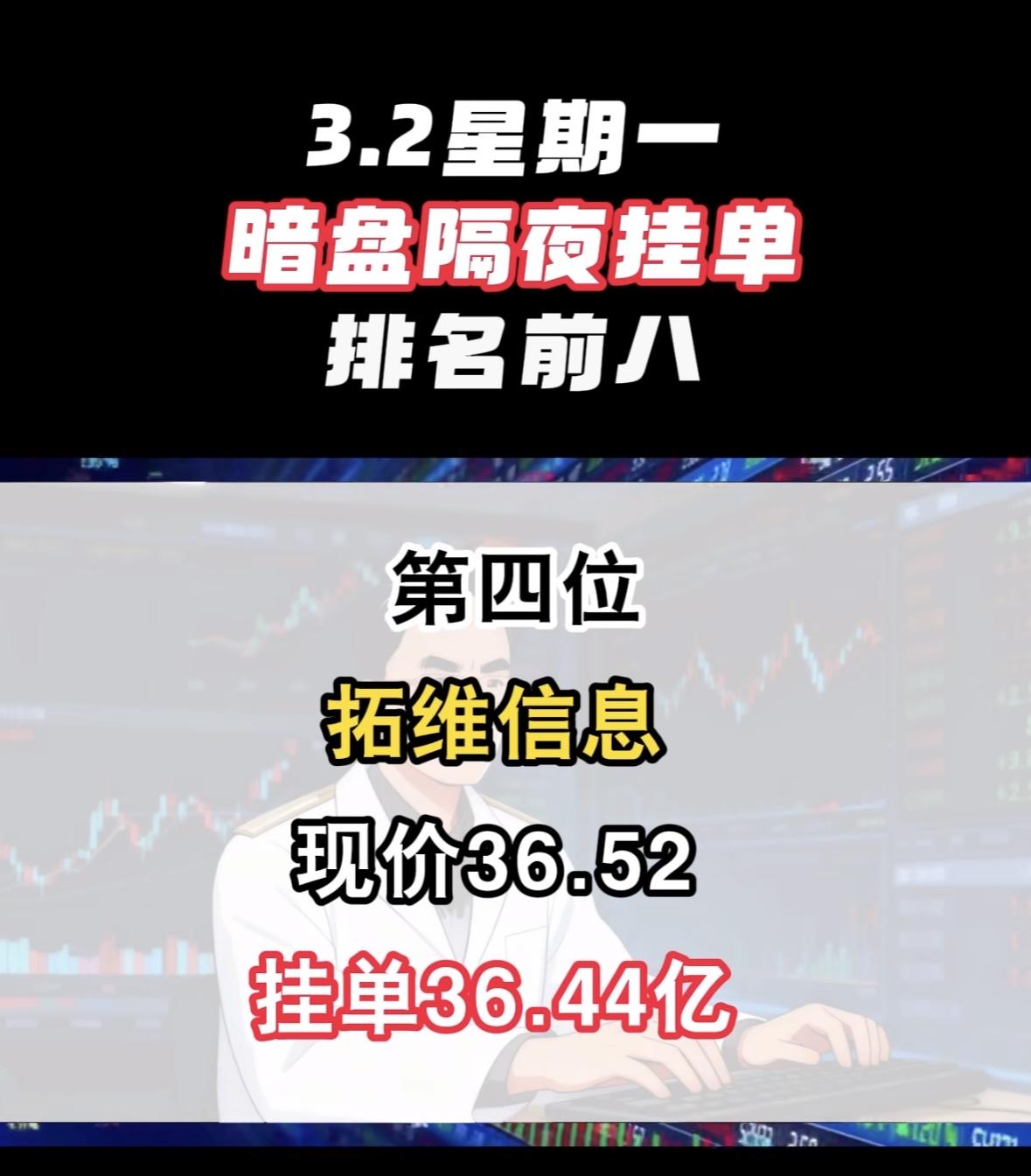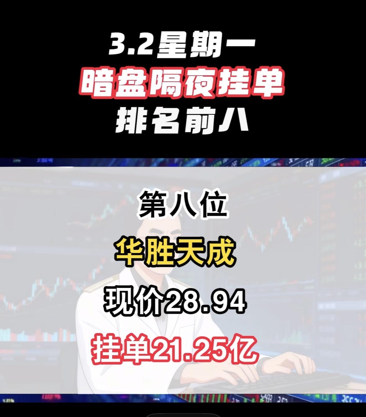 3.2星期的暗盘隔夜挂单排名前八,华胜天成现价28.94,挂单21.25亿!