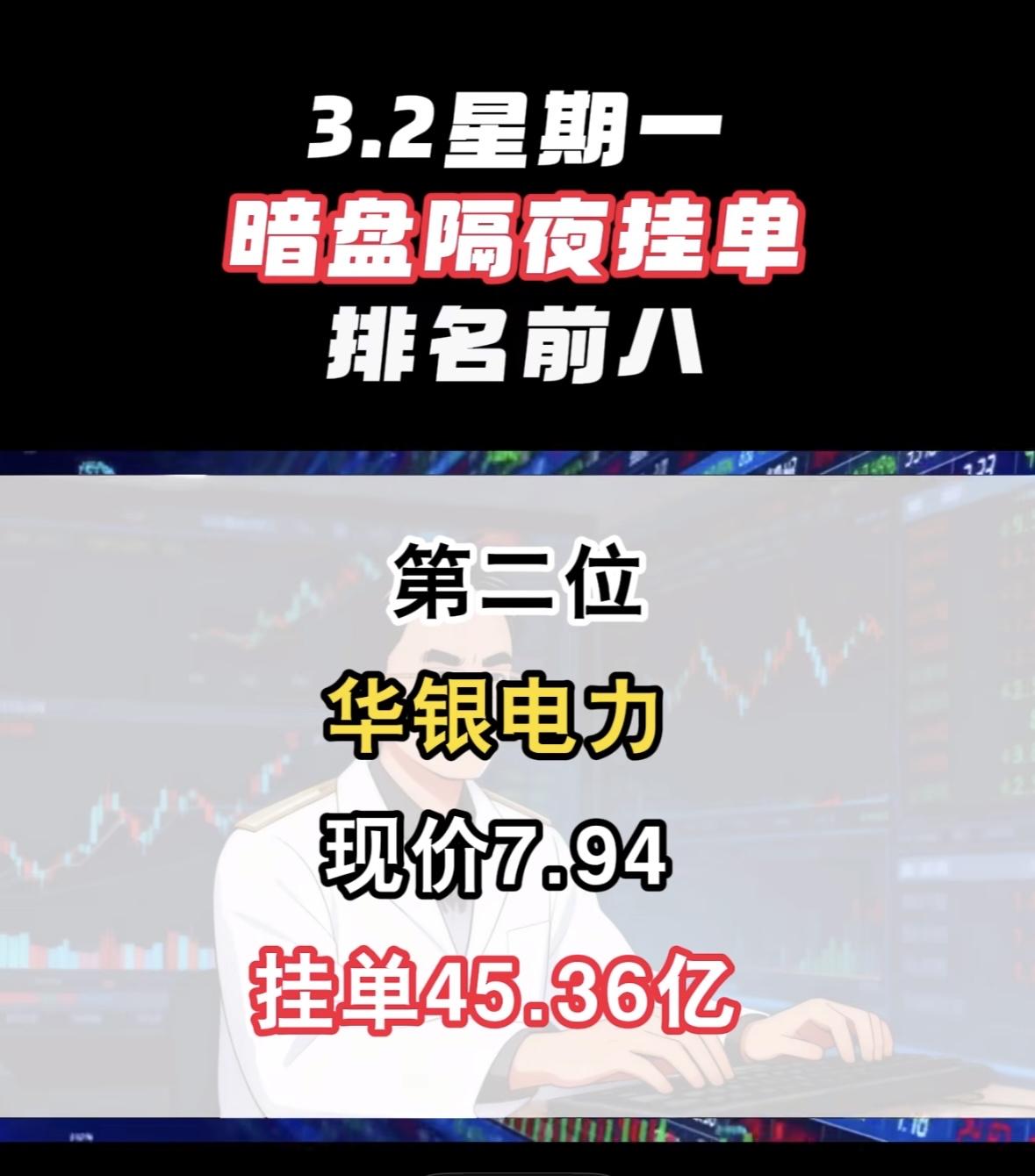 3.2星期的暗盘隔夜挂单排名前八,华胜天成现价28.94,挂单21.25亿! "金正大暗盘领跑,现价吸睛,巨额挂单显强势,市场热度聚焦前八。"