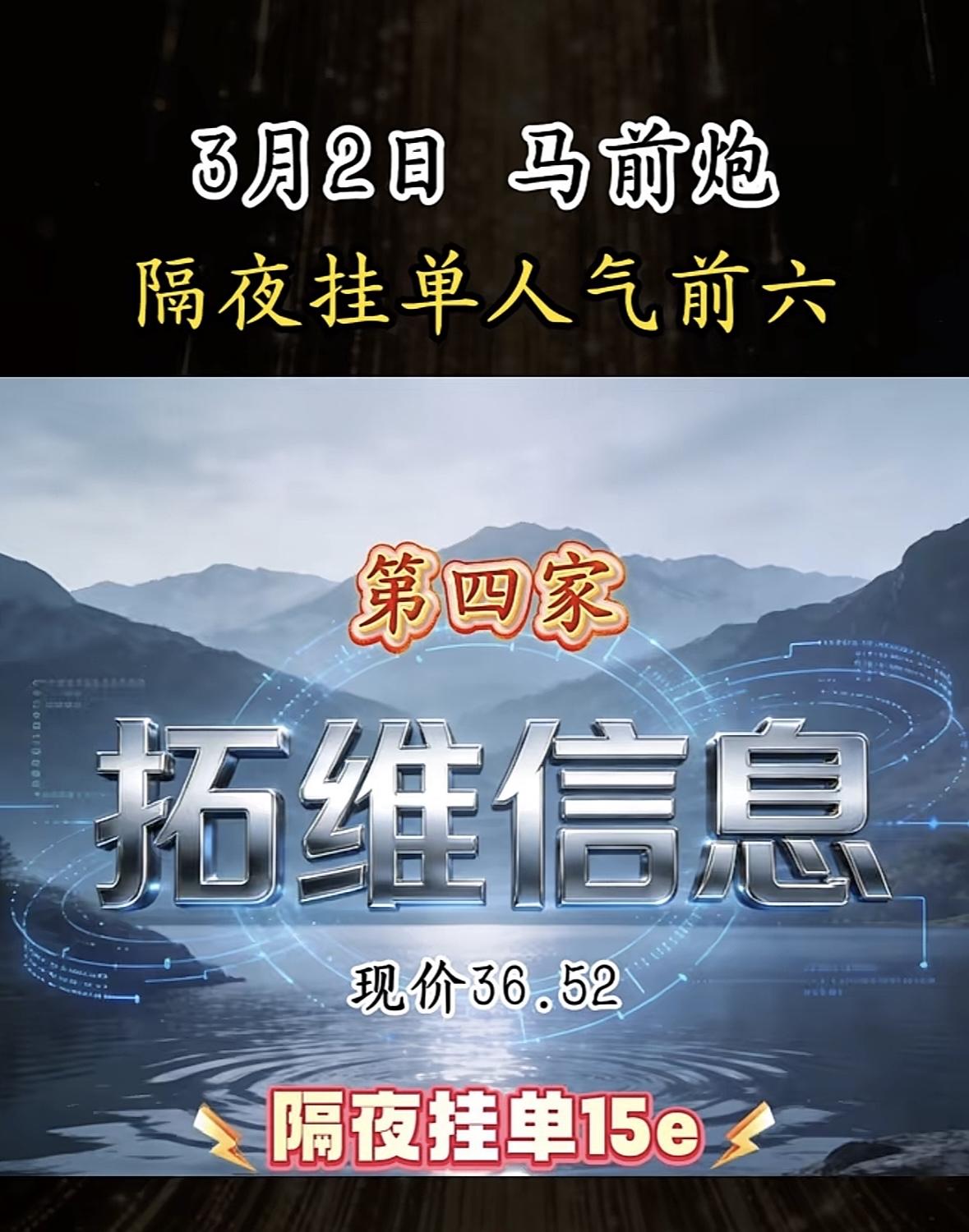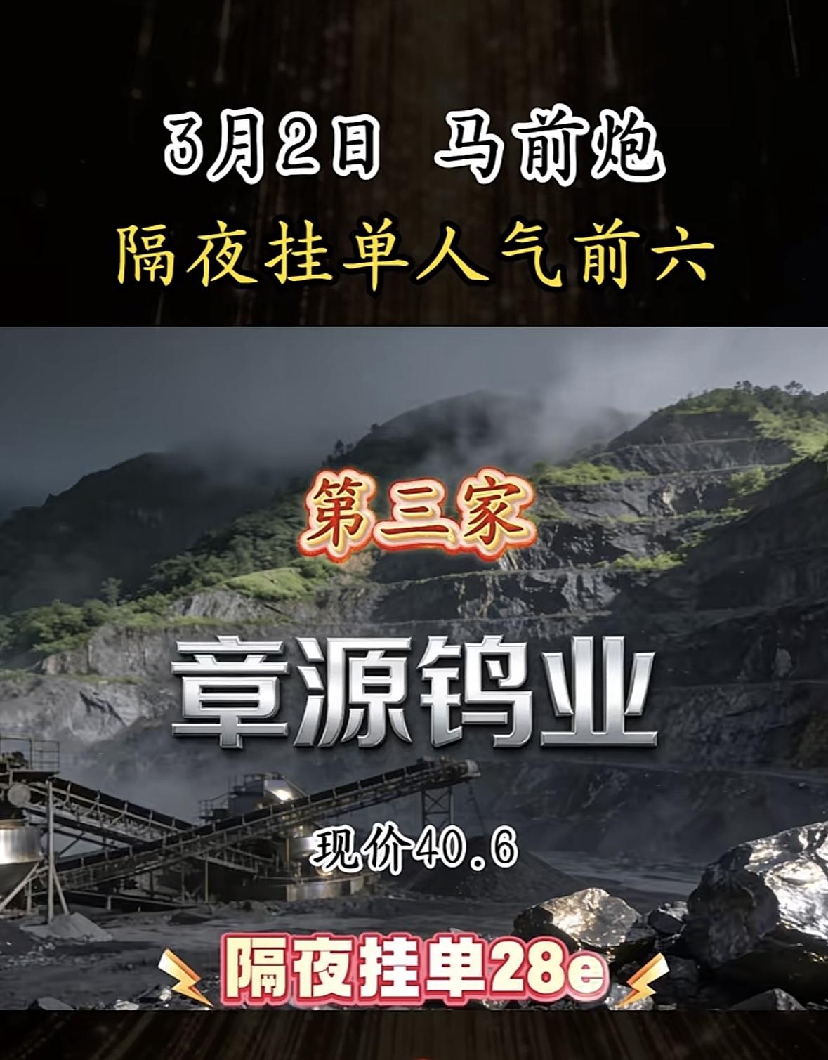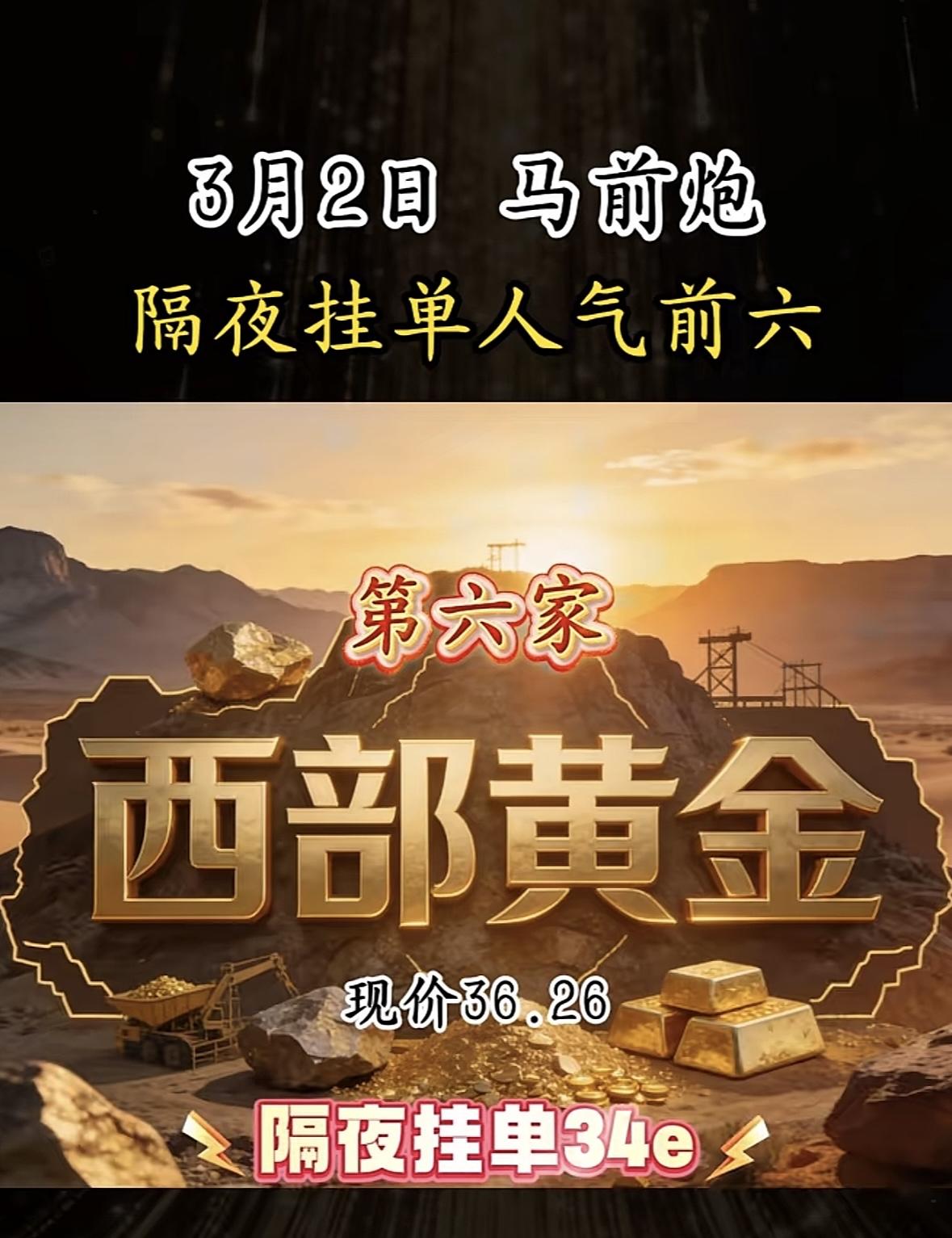 3月2日暗盘隔夜挂单前6名揭晓,西部黄金现价36.26,隔夜挂单34e,第六家黄金矿场! "黄金概念股热度飙升,隔夜挂单人气高涨,市场关注度持续攀升,投资者情绪积极。"