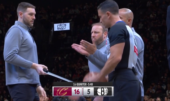比赛的第一节,阿伦空接双手暴扣骑士领先到11分,篮网叫出暂停。