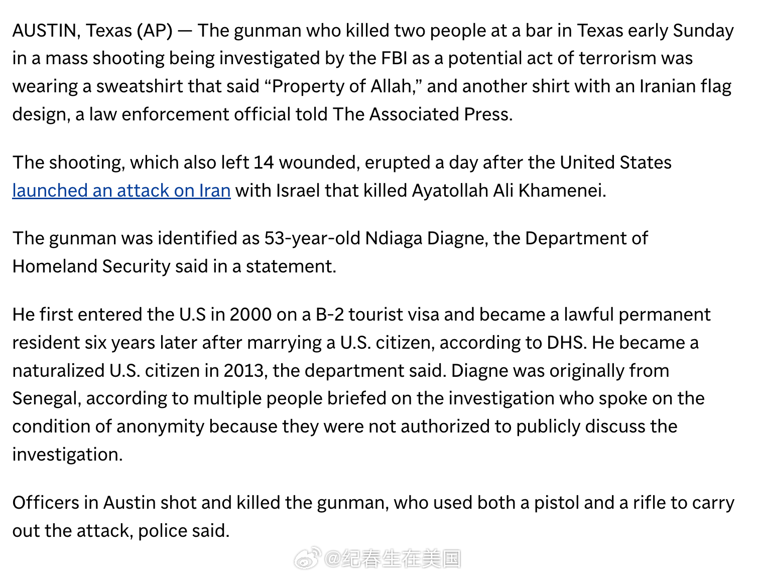 一名枪手周日凌晨在德州奥斯汀一家酒吧开枪打死了2人,另有14人受伤。联邦调查局正在将这起大规模枪击事件作为可能的恐怖主义行为调查。