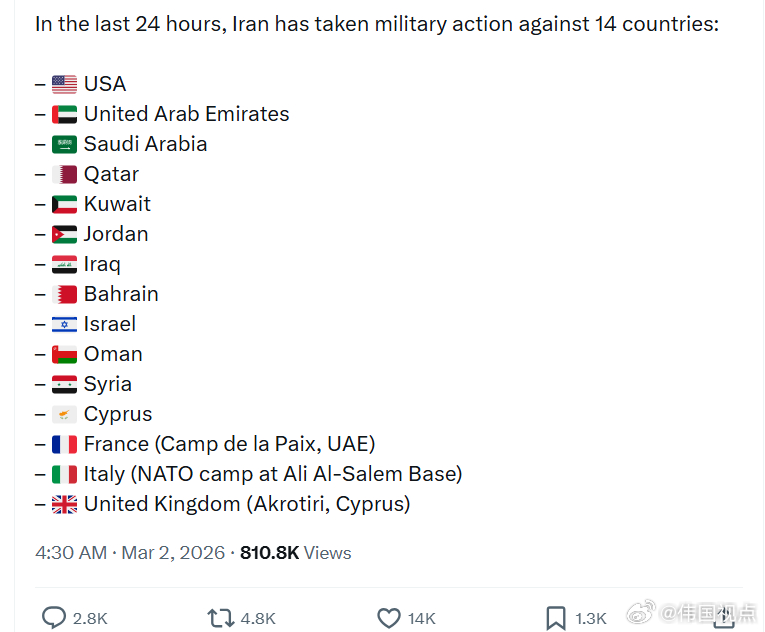 在过去24小时内,伊朗对14个国家采取了军事行动: