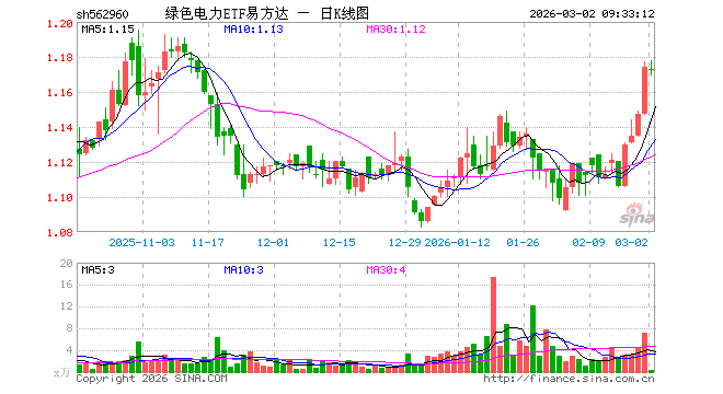 3月2日,绿色电力ETF易方达(562960)开盘跌0.09%,报1.173元。绿色电力ETF易方达(562960)重仓股方面,长江电力开盘涨0.31%,中国核电涨0.00%,三峡能源跌0.24%,国电电力跌0.20%,华能国际跌0.41%,国投电力跌0.38%,上海电力跌1.56%,川投能源涨0.07%,浙能电力跌0.56%,华电国际跌0.78%。
