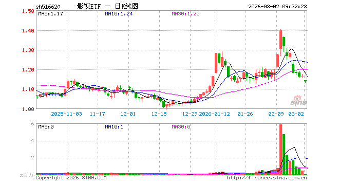3月2日,影视ETF(516620)开盘跌1.63%,报1.145元。影视ETF(516620)重仓股方面,光线传媒开盘跌2.72%,完美世界跌1.67%,东方明珠跌2.09%,芒果超媒跌2.38%,万达电影跌2.19%,捷成股份跌2.93%,中国电影跌2.76%,视觉中国跌4.76%,华策影视跌2.56%,江苏有线跌2.15%。