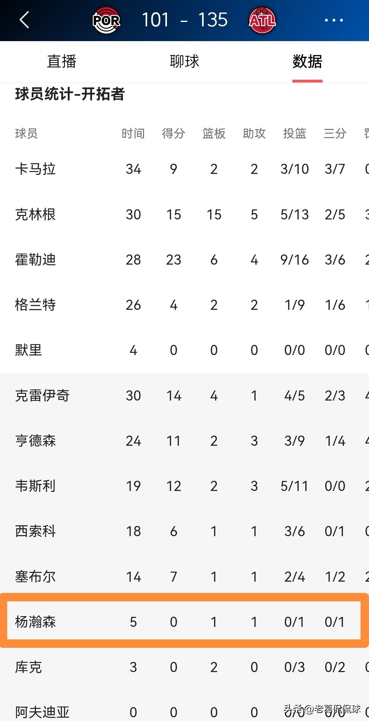 开拓者新秀杨瀚森终于不气喘吁吁了!在今天开拓者客场以101:135惨败于老鹰的比赛中,杨瀚森破天荒的得到了5分47秒的上场时间,虽然杨瀚森在场上依然没有存在感,但是他的体能状况真的越来越好了,他在来回奔跑以后不再气喘吁吁了。 全场比赛下来,杨瀚森替补出战5分钟,投篮1中0没有得分,只有1篮板和1助攻,没有出现任何的失误和犯规,他的场上正负值为-11。 实事求是的说,如今的杨瀚森在很多方面都有了非常大的提高,比如体能方面、控制失误和犯规方面以及单防和补防方面。