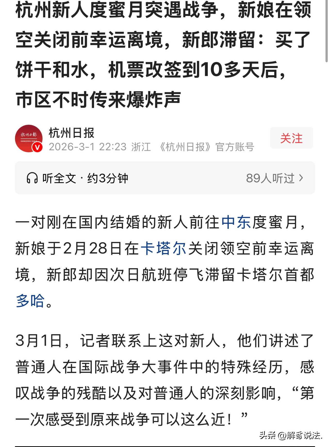 浙江杭州,90后女子刚完婚,就在大年初三飞中东度蜜月。没想到一路高高兴兴的到那,傻眼了,战争爆发了。小两口赶紧打道回府。却发现积分兑换机票限制,妻子在领空关闭前幸运回国。可丈夫被迫滞留异国他乡。让他崩溃的是,酒店每晚从600元涨到1200。飞机改签需要多花3.5万,他心疼钱,决定改签到10天后回国。耳边爆炸声不断,丈夫心惊胆战,国内的妻子忐忑不安,担心丈夫的安危。网友:不差那点钱,命重要! 一对杭州90后小夫妻,春节前刚办完婚礼,满心欢喜去中东度蜜月,两个人都对这场浪漫之旅充满了期待,没想到最后一站多哈,撞上了突发战事,好好的蜜月直接变成惊魂时刻,原本的甜蜜瞬间被恐慌取代。 大年初三出发,一路玩得挺顺利,两人沉浸在新婚的幸福里,到多哈准备收尾返程,心里还盘算着回家后的小日子。 因为机票是积分换的,时间没法凑到一起,妻子郑女士选了2月28日上午飞悉尼的航班,丈夫虞先生则是第二天同一班。 谁也没料到,这一天之差,就是天壤之别,谁会想到,一次普通的航班错开,竟会变成一场分离。 郑女士的飞机顺利起飞,升空没多久就传来消息:中东战事爆发,卡塔尔直接关闭领空。 她坐在飞机上心惊肉跳,一边庆幸自己顺利离开,一边又揪着心惦记还在当地的丈夫。 她人是安全走了,可丈夫还留在多哈,第二天的航班彻底停飞,人就这么滞留在了异国他乡。 孤身一人身处战乱之地,虞先生的心里瞬间被不安填满,慌乱又无助。 虞先生一开始住在多哈卡塔拉文化村的酒店,靠近珍珠岛,一开始还听不到动静,心里还抱着一丝侥幸,以为局势没有那么严重。 后来换到市区酒店,才真切感受到紧张,时不时就能听到爆炸声,每一声巨响都让他心头一紧,心里难免发慌,甚至会忍不住胡思乱想,害怕意外会突然降临。 更闹心的是房价,28日下午直接从600多涨到1200,看着突然翻倍的价格,他既无奈又焦虑,好在,隔天又回落了,街上游客也没几个,酒店生意也冷清,整个城市都笼罩在压抑的氛围里。 吃饭方面,酒店有早餐,赶上斋月中午没堂食,他就备了饼干和水,也能点外卖凑合。可就算填饱了肚子,心里的忐忑依旧挥之不去,食不知味。 工作上已经跟墨尔本的公司说明情况,老板也让他先顾着安全。 听到老板的安慰,他心里稍稍踏实了一点,可安全问题悬在眼前,依旧无法真正放松。 航班这边更折腾。 临时改签商务舱要3.5万,改其他航班又贵又麻烦,他只能免费改到3月13日,硬生生要多等10多天。 一想到还要在不安中熬上十几天,他既绝望又无奈,只能默默祈祷局势快点好转。 夫妻俩隔着万里,一边是提心吊胆,日夜牵挂、寝食难安,一边是身处险境,紧张惶恐、度日如年。 虞先生说,这辈子第一次觉得战争离自己这么近,那种无力又恐惧的感觉刻骨铭心,原本甜蜜的蜜月,硬生生被突发局势打断,也让普通人真切体会到,和平有多珍贵。 现在就盼着局势快点平稳,航班早日恢复,这对新婚夫妻能早点团聚,让这场惊魂的蜜月,能有一个平安的结局。 此事曝光后,网友纷纷给出了个人看法: 改签三万五,酒店一天一千二,十天也是一万二了,还担心生命安全。在生命安全面前,什么都是零。 典型的要钱不要命。为什么当时不放弃积分兑换机票,花钱另外新买机票不就行了。 这对新婚夫妇真的是印正了“夫妻本是同林鸟,大难临头各自飞”的古语 《民法典》第820条规定:承运人应当按照客票载明的时间和班次运输旅客。承运人迟延运输或者有其他不能正常运输情形的,应当及时告知和提醒旅客,采取必要的安置措施,并根据旅客的要求安排改乘其他班次或者退票;由此造成旅客损失的,承运人应当承担赔偿责任,但是不可归责于承运人的除外。 虞先生航班停飞是战争(不可抗力)导致,不属于航司责任。所以航司可以不赔额外损失(如高价住宿、改签差价),但必须提供免费改签或退票,这也是他能免费改到3月13日的法律依据。 临时改签要3.5万,属于航司正常票价/舱位差价,并非违规收费。 《维也纳领事关系公约》第5条(领事保护) 领事职务包括:在国际法许可之限度内,在接受国中保护派遣国及其国民之利益;帮助及协助派遣国国民。 虞先生是中国公民,滞留多哈遇战事,中国驻卡塔尔使领馆有法定领事保护义务。 他可联系使馆获取安全提醒、协助联系航司、必要时协调撤离等。战争属于领事保护的典型场景,使馆会优先保障本国公民安全与基本权益。 战争属于不可抗力,航司只负责免费退改不赔额外损失;同时,中国公民在海外遇战乱,可依法向中国使领馆申请领事保护。 欢迎关注@解豸说法.