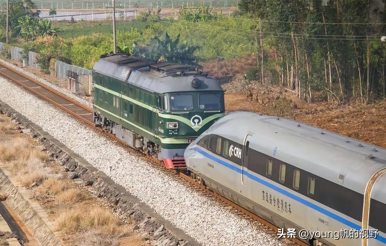 铁路上古老与现代的组合——东风4B内燃机车牵引青铜剑高铁检测车行驶在粤海铁路湛海段上。之所以会出现这种组合,是因为大陆与海南岛之间的铁路未能实现电气化,因此需要由内燃机车作为接驳牵引。当这列动车组过海之后,就可以自行行驶在环岛铁路上,开启岛内的安全检测了。因此每当有动检通过时,在湛海线上都可以看到这样的稀有场景,成为不少火车迷跟踪打卡记录的重要事项。