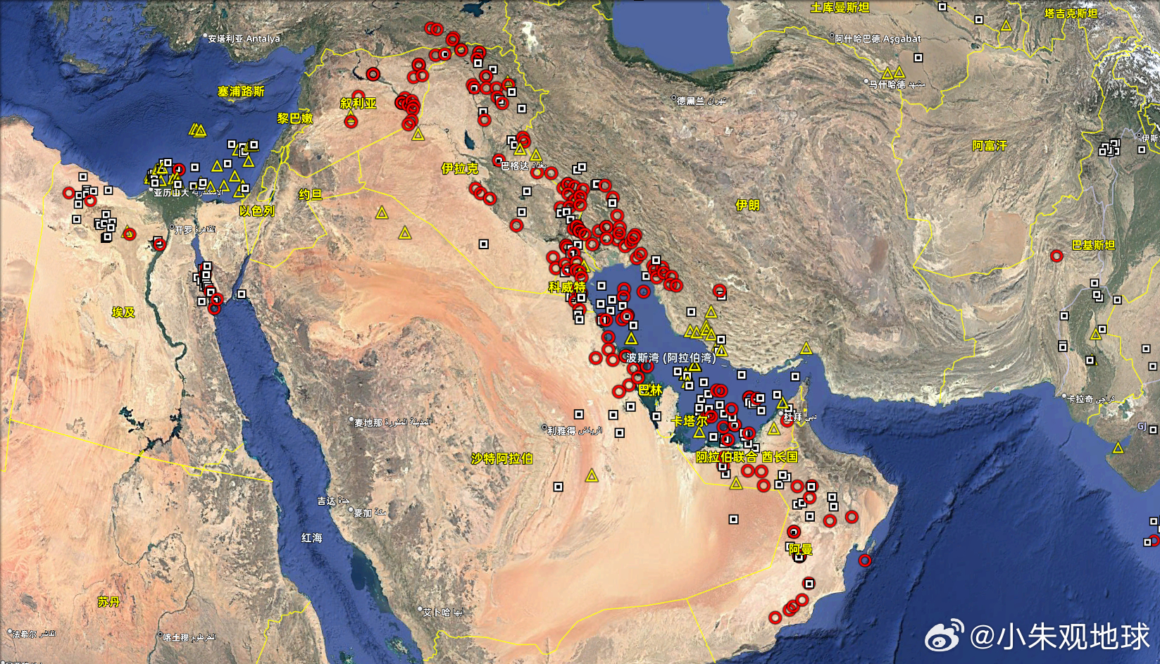 波斯湾周边油气资源分布,黄三角汽井,红圈是油井、黑方框是油气井 8个主要产油国宣布增产美伊以冲突伊朗局势