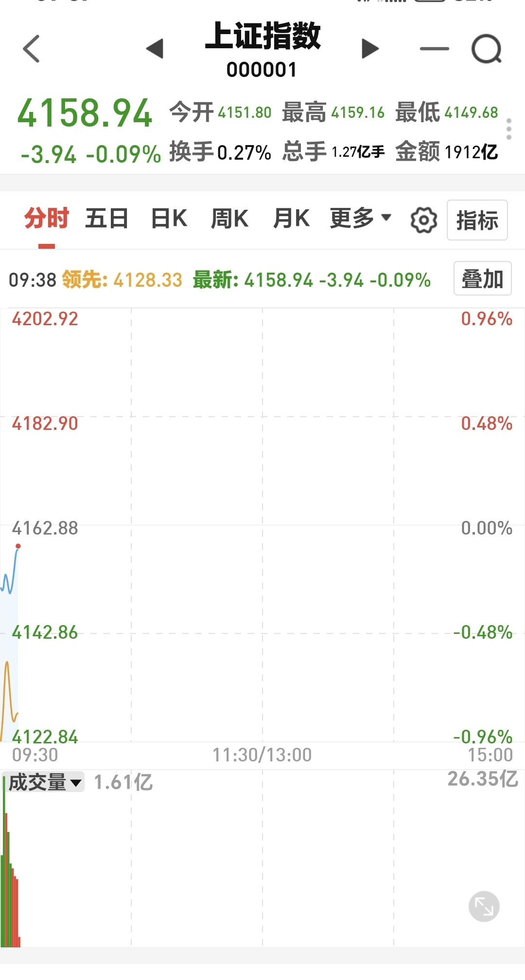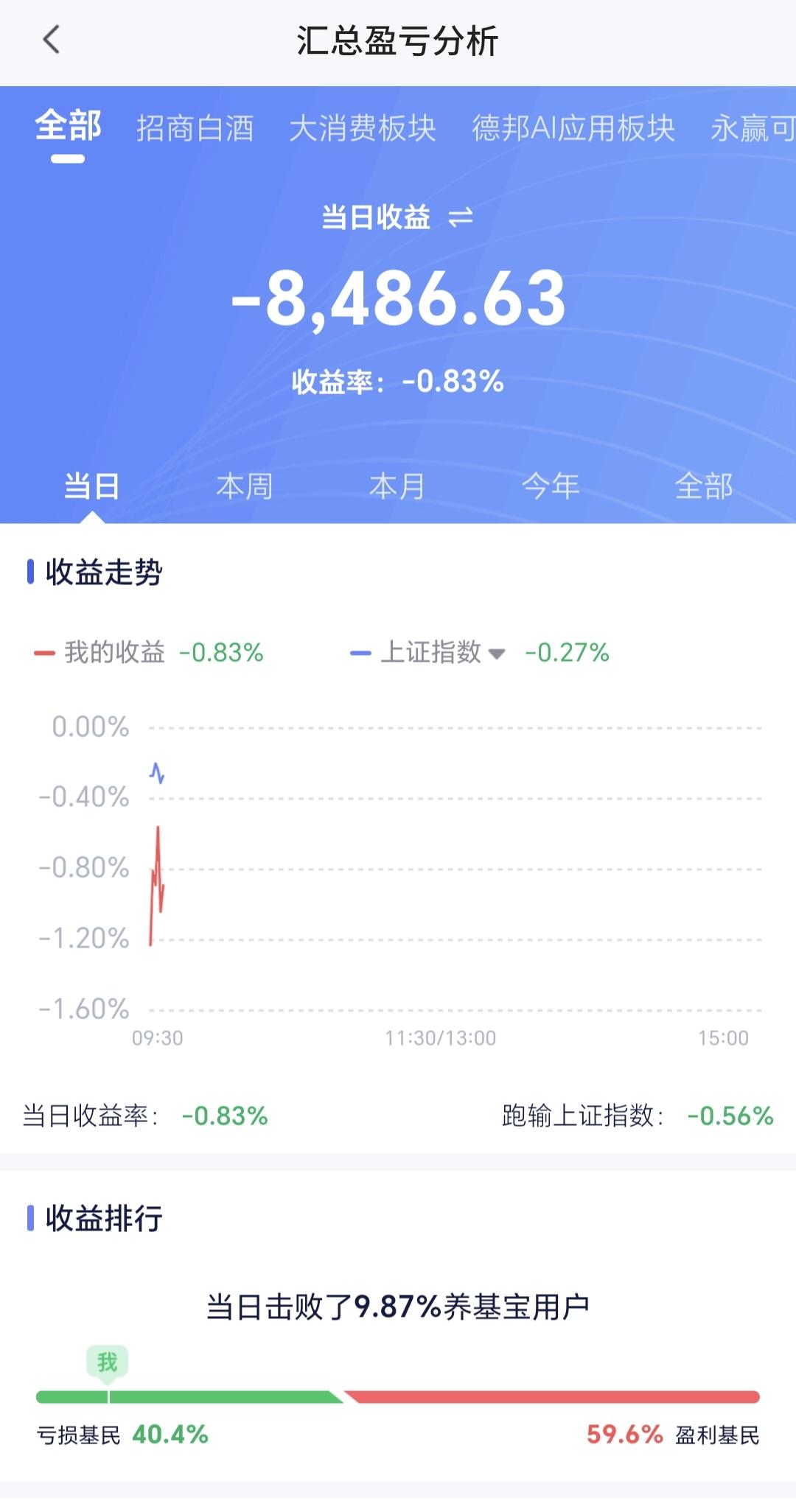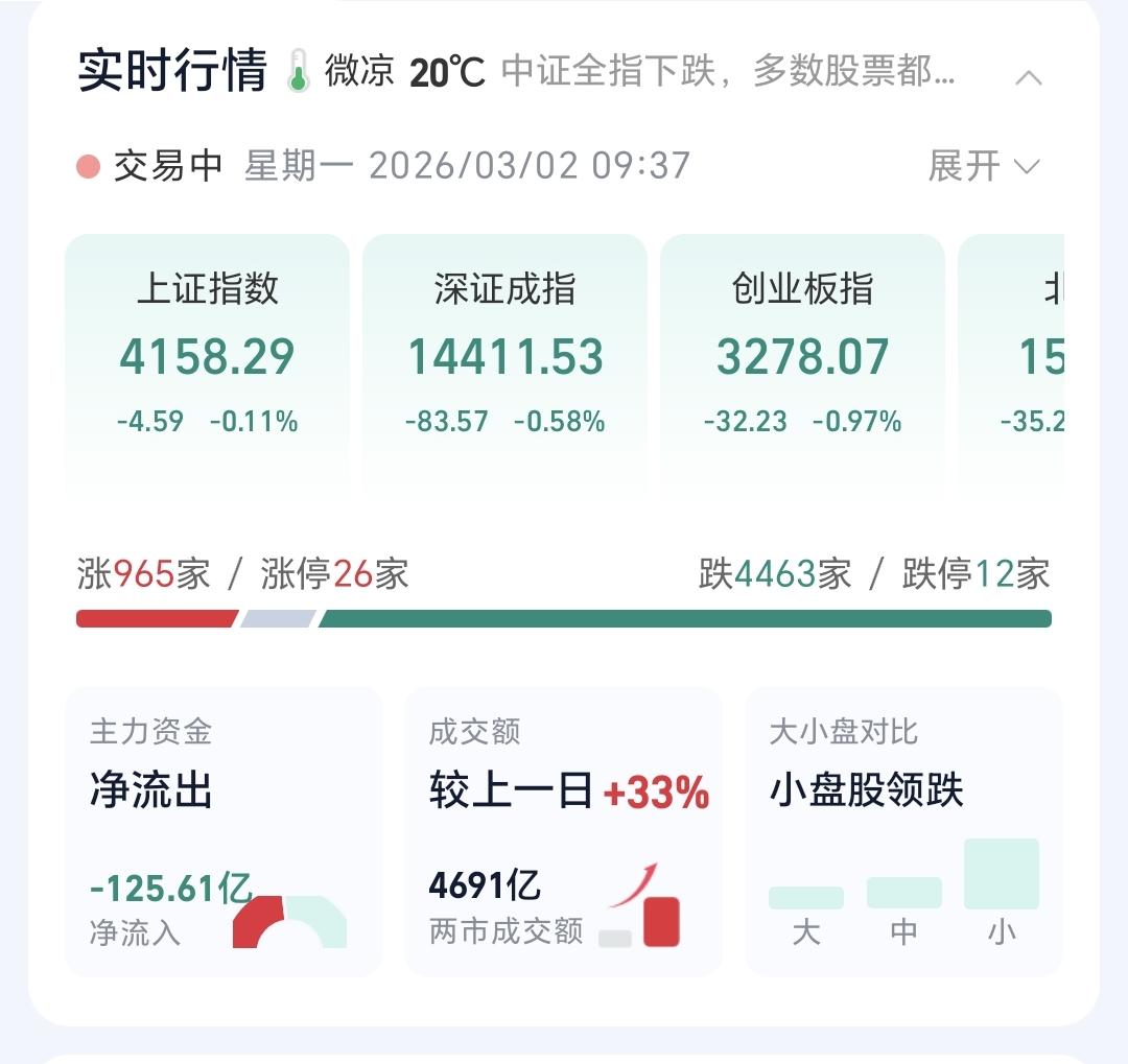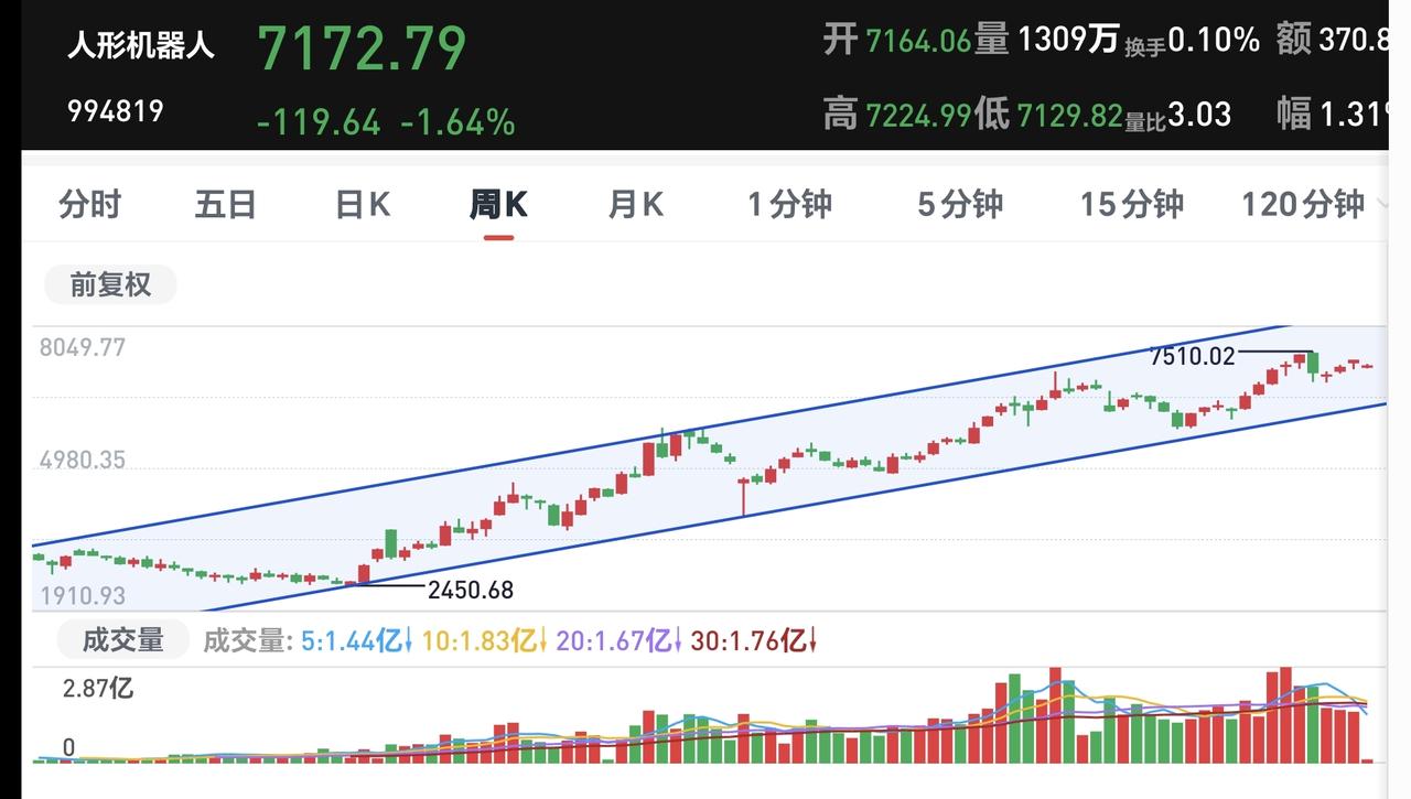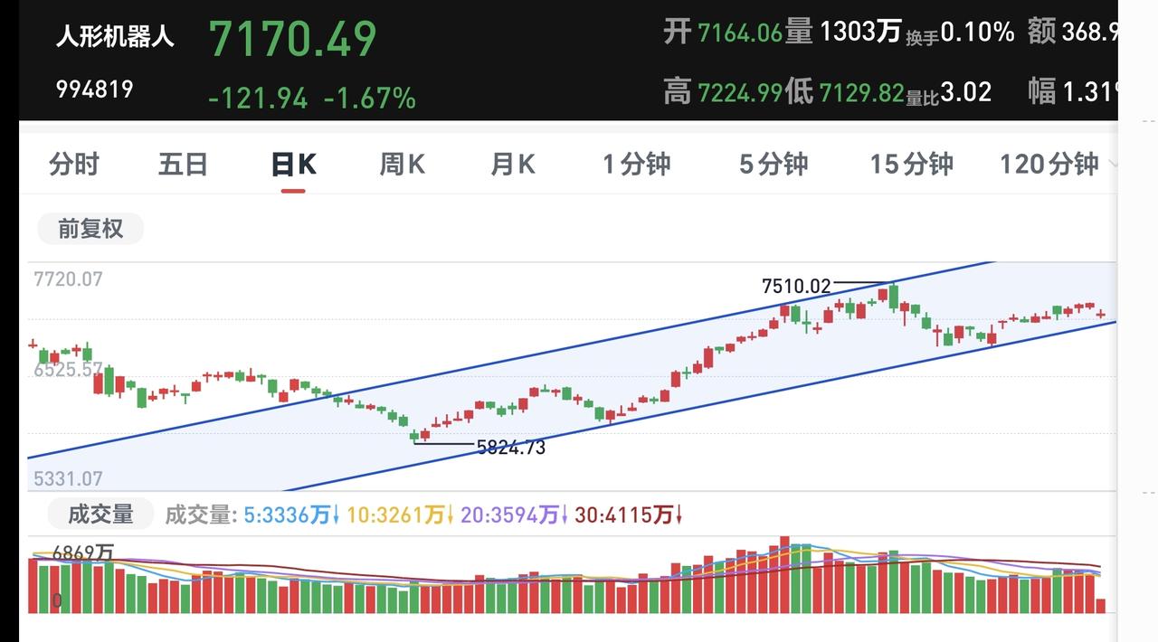 基金:机器人板块大跌,可不可以继续持有 今天市场低开,三大指数都是低开,开盘以后指数震荡向上,现在的下跌幅度已经缩小,创业板指下跌了0.72%,盘中点位3286点,上证指数下跌了0.10%,盘中点位4158点。 两市累计成交4691亿,相比于上周五同期放量了33%,上涨900多家,下跌4400多家,下跌家数远远超过了上涨家数,涨停26家,跌停12家,主力资金净流出125亿。 整个市场上涨幅度最大的三个板块是:油气资源板块,黄金股板块,煤炭板块,下跌幅度最大的三个板块是:交通运输板块,北证板块,恒生科技板块。 持有基金现在盘中估值亏损了8486元,盈利金额最大的三个板块是:5G板块,大消费板块,军工板块,亏损金额最大的三个板块是:证券板块,芯片半导体板块,创新药板块。 现在盘中上证指数已经翻红,场内的人这个时候千万不可以追高,市场指数越是接近4190点,我们越是要考虑要不要进行再一次止盈,现在黄色线与蓝色线之间的敞口非常大,冲高回落的概率非常大。 机器人板块今天下跌,日线级别处于上涨趋势中,今天的下跌并没有能够改变日线级别的下跌趋势,短线持有的人可以继续持有,日线级别上涨通道的下轨线是短线持有者的持有条件,只要不跌破这个上涨通道的下轨线,都可以继续持有。 机器人板块周线级别也是处于上涨通道中,上涨通道的下轨线是长线持有者的持有条件,现在距离上涨通道的下轨线比较远,小幅度的上涨和下跌都改变不了机器人板块周线级别的上涨趋势,长线持有者坚定持有。 花1秒钟点赞,花30秒钟评论,就是对我最大的支持,谢谢大家的支持。