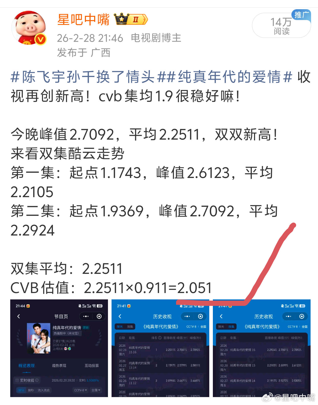 姐姐姐夫共创2月28日cvb收视日报陈飞宇孙千《纯真年代的爱情》单日破2!今年最强走势!不,央八史上最强走势剧集!从头涨到尾