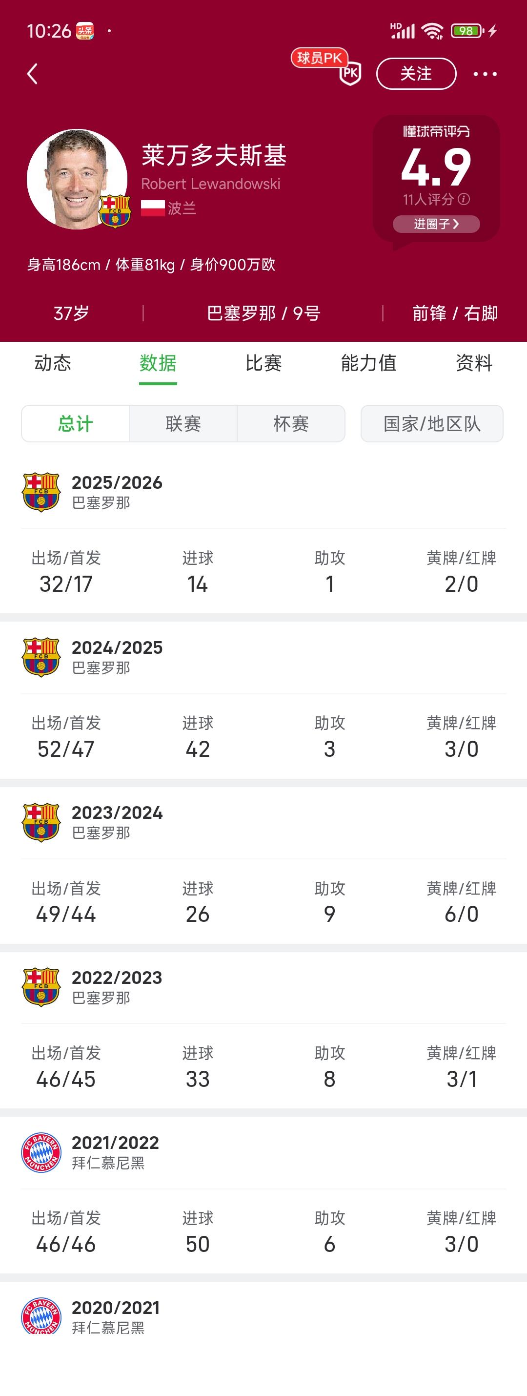 莱万在巴萨的日子倒计时了,没办法输给了年龄。 本赛季14球1助攻,跟上赛季42球不能比。 在拜仁时期年年50+进球呢。 岁月不饶人,前锋这个年龄谁都不行,只有门将还能混一混,再见啦神锋。[可怜][可怜]
