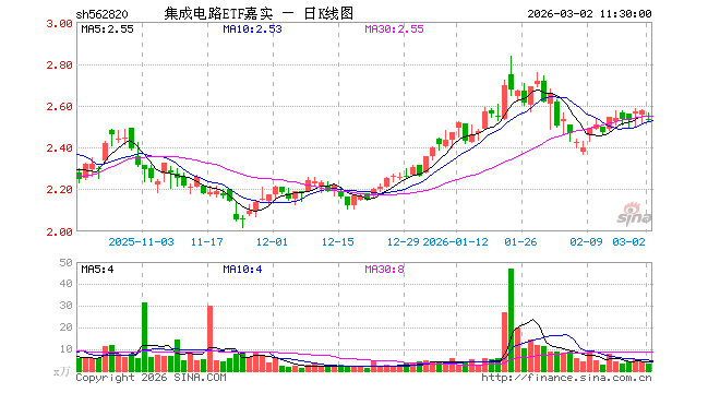 3月2日,截止午间收盘,集成电路ETF嘉实(562820)跌1.71%,报2.530元,成交额831.11万元。集成电路ETF嘉实(562820)重仓股方面,寒武纪截止午盘跌0.00%,中芯国际跌2.02%,海光信息跌0.44%,兆易创新跌1.82%,澜起科技跌2.05%,豪威集团跌3.07%,紫光国微涨0.06%,长电科技跌2.45%,芯原股份跌1.55%,通富微电跌1.62%。