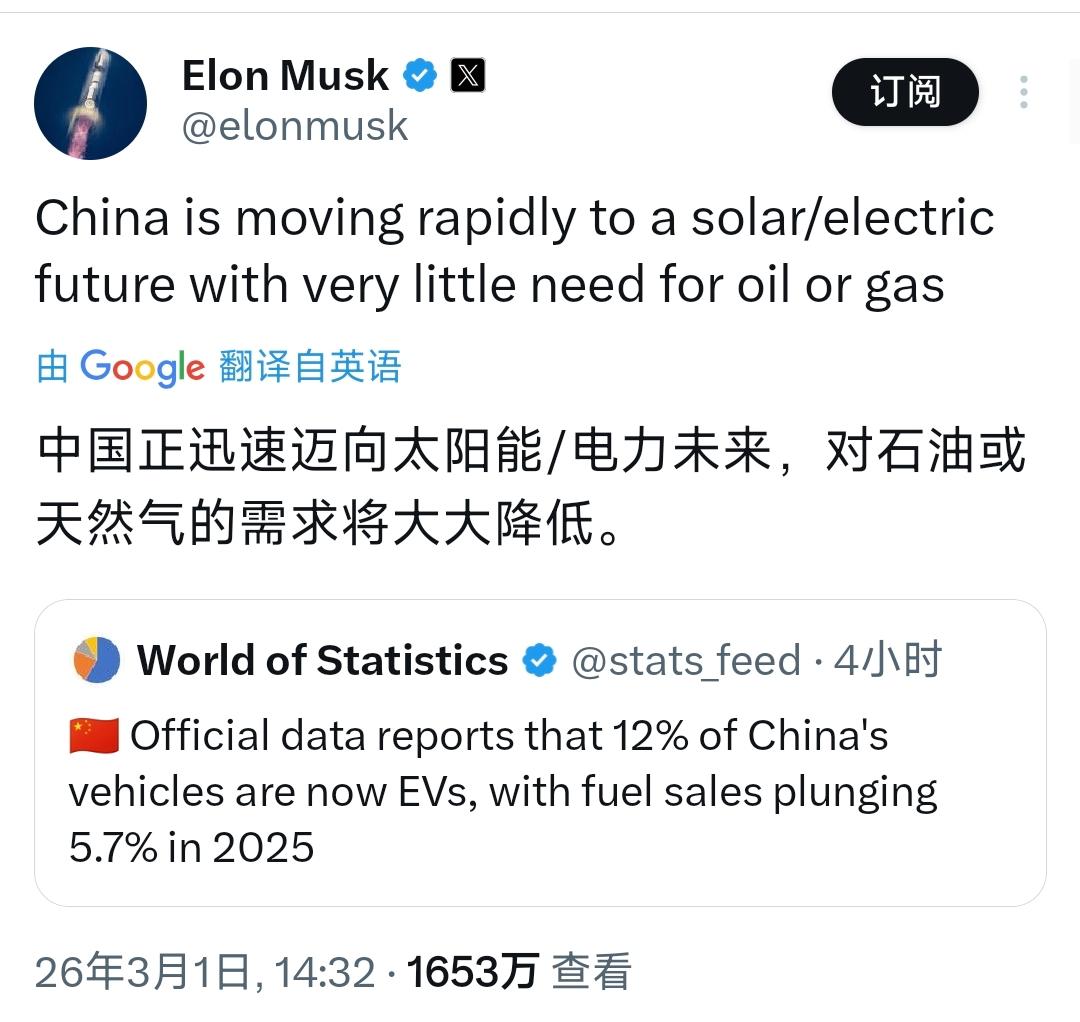 埃隆·马斯克北京时间3月1日写道:“中国正迅速迈向太阳能/电力未来,对石油或天然气的需求将大大降低。” 看得出来,马斯克对中国在太阳能和电力领域的发展,满是羡慕,反观对热衷于传统能源的美国前总统特朗普,他却不敢多言语,两者对比,更能看出中国在能源转型上的底气和实力。 马斯克之所以这么说,核心就是羡慕中国在太阳能和电力领域的发展速度和规模,反观美国,在这方面就慢了很多,尤其是特朗普,一直热衷于传统能源,到处鼓励开采石油、天然气,还不看好太阳能这类新能源,马斯克就算有不同意见,也不敢直接反驳,毕竟特朗普在美国的影响力不小,而且美国的能源政策,也一直被传统能源利益集团牵着走。 咱们普通人可能没太留意,其实这些年,中国在太阳能领域的发展,早就走在了世界前列,身边的变化就能看出来。不管是农村的屋顶上,还是城市的工业区、停车场,到处都能看到太阳能板,这些板子能把太阳的能量转换成电能,既环保又省钱。 而且国家也一直在大力扶持,建了很多大型的太阳能发电基地,比如“沙戈荒”风电光伏基地,规模大得惊人,能满足很多地方的用电需求。 根据国家能源局3月1日刚发布的数据,截至2025年底,咱们中国的可再生能源总装机已经达到23.4亿千瓦,其中光伏和风电的合计装机量,已经超过了火电,达到18.4亿千瓦,这是以前想都不敢想的事。 要知道,火电就是烧煤、烧天然气发电,而光伏就是太阳能发电,这说明,咱们国家的电力供应,已经慢慢从依赖传统能源,转向了清洁的太阳能、风能这些新能源。 还有一组数据,大家一听就明白,现在咱们国家全社会用电量中,绿电(也就是太阳能、风能发的电)占比已经接近四成,相当于每用10度电,就有近4度是太阳能、风能发出来的。 而且截至2025年底,中国的太阳能发电装机容量已经达到1200GW,同比增长了35.4%,“十四五”期间,光伏累计新增装机量,是“十三五”的4.5倍,这样的增长速度,在全球都是数一数二的。 马斯克自己也在布局太阳能产业,他计划未来三年,让特斯拉和SpaceX各自实现100GW的太阳能制造能力,还想发射太阳能卫星,利用太空的日照优势发电。 但他也坦言,中国的光伏产品又好又便宜,可美国对进口光伏产品征收的关税特别高,这让美国的太阳能发展成本大大增加,也拖慢了进度。对比之下,中国不仅有完整的光伏产业链,还在不断突破新技术,成本也控制得很好,这也是他羡慕中国的重要原因。 可能有人会问,发展太阳能,跟石油、天然气有啥关系?其实很简单,咱们平时用电、开车,很多都要靠石油、天然气。 以前电力供应不足,很多地方发电靠烧天然气、烧煤,开车靠烧汽油、柴油,这些都离不开石油和天然气。 而现在,太阳能发的电越来越多,既能满足家庭、工厂的用电需求,还能用来给电动汽车充电,咱们身边的电动汽车也越来越多,路上跑的电动车多了,烧汽油的车就少了,对石油、天然气的需求自然就降下来了。 马斯克心里很清楚,未来的能源趋势,一定是清洁、可再生的,太阳能就是最好的选择,而中国已经走在了前面,正在快步迈向太阳能和电力的未来。 反观美国,特朗普一直推崇传统能源,忽视新能源的发展,这不仅让美国的能源转型慢了下来,还影响了美国人工智能产业的发展,因为人工智能需要大量的电力,而太阳能不足,电力供应跟不上,就会制约人工智能的发展。 马斯克虽然是美国人,但他看问题很客观,不会因为自己是美国人就偏袒美国,他知道中国在太阳能领域的优势,也敢直言不讳地说出来,哪怕面对特朗普的传统能源理念,他不敢多言语,但对中国的发展,他毫不掩饰自己的羡慕。 他说中国对石油、天然气的需求会大大降低,不是凭空猜测,而是基于中国现在的发展现状,基于中国越来越完善的太阳能、电力体系。 咱们老百姓可能感受不到那么多专业的数据,但身边的变化骗不了人:农村的太阳能路灯越来越多,家里装太阳能热水器、太阳能发电板的人越来越多,路上的电动汽车越来越多,加油的次数越来越少,电费也越来越实惠。这些变化,都说明中国正在一步步迈向太阳能电力时代,也印证了马斯克的判断。 其实马斯克的这番话,也从侧面反映出,中国这些年在能源转型上的努力没有白费。咱们国家一直坚持绿色发展,大力发展太阳能、风能等新能源,不仅保护了环境,还减少了对进口石油、天然气的依赖,不用再看别人的脸色,这也是咱们国家的底气所在。 马斯克不敢对特朗普的传统能源理念多言语,却敢直言羡慕中国的太阳能发展,足以说明,中国在太阳能和电力领域的成就,已经得到了全球的认可。