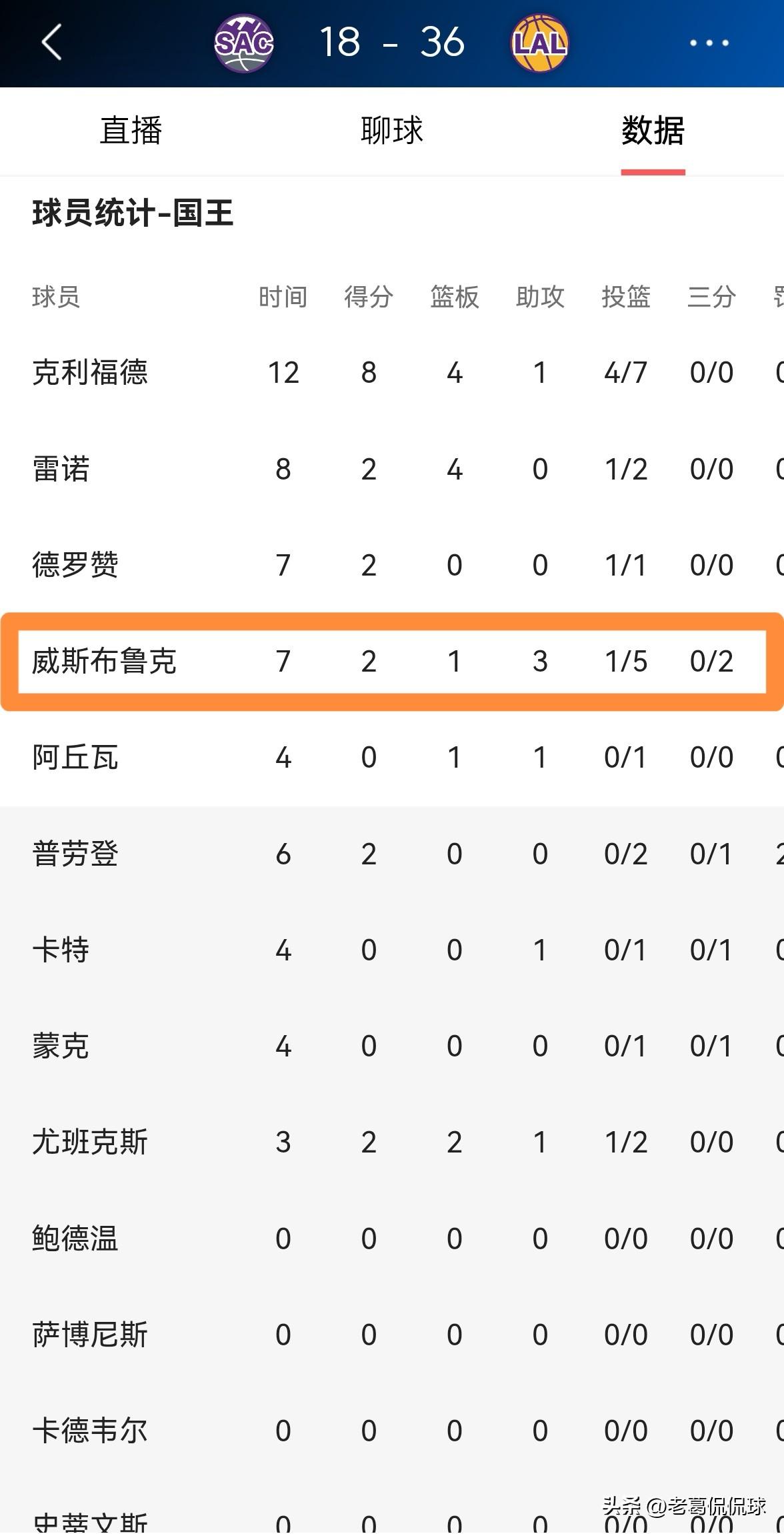 国王球星威斯布鲁克真是太反常了!在今天国王客场挑战湖人的比赛中,目前双方的首节比赛已经结束,国王以18:36落后对手18分。让人感到非常意外的是,在第一节比赛中,威少的表现和之前打湖人时的表现相差甚远,他在首发出战的7分钟里,投篮5中1,其中三分球2中0非常低效的得到2分,还有3次失误,他的场上正负值为-11。 众所周知,在此之前,威少一遇到老东家湖人就特别起劲,然而今天威少却一反常态,不仅进攻效率低下,而且斗志全无。