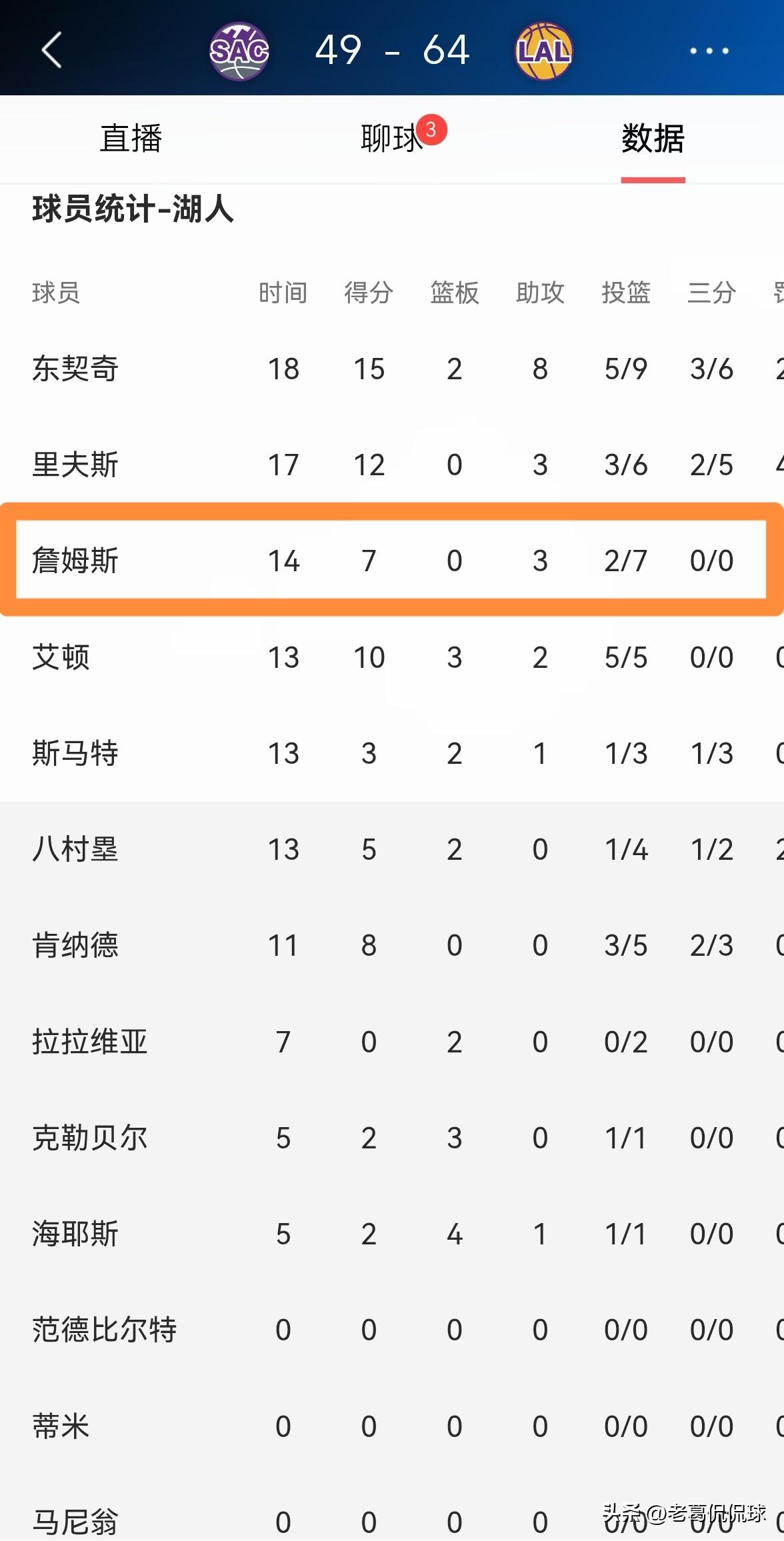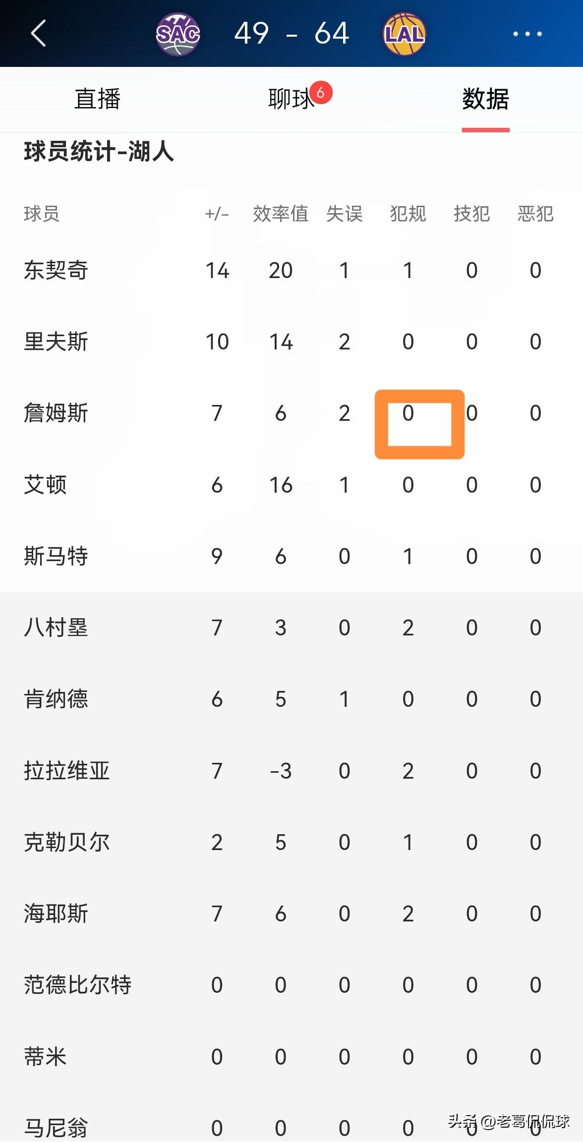 湖人超级球星詹姆斯又是半场比赛零犯规!在今天湖人主场迎战国王的比赛中,目前双方半场战罢,湖人以64:49领先对手。值得一提的是,在前两节比赛中,詹姆斯再次零犯规。 在上半场比赛中,詹姆斯首发出战14分钟,投篮7中2,其中罚球4中3得到7分3助攻2抢断,还有2次失误,没有出现犯规,他的场上正负值为+7。 以目前的情况来看,不出意外的话,等本场比赛结束的一场时候,詹姆斯的犯规数极有可能仍然是零。