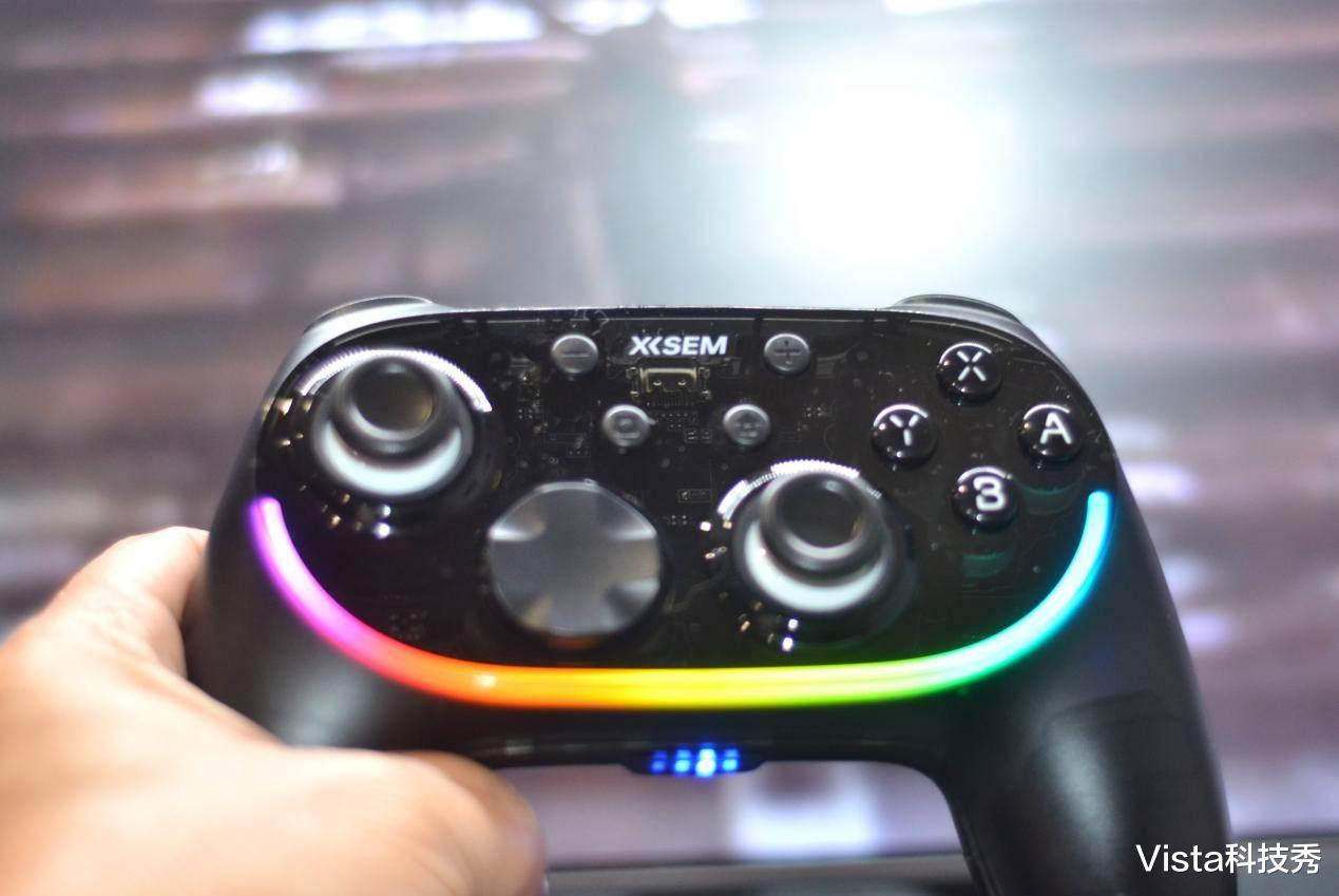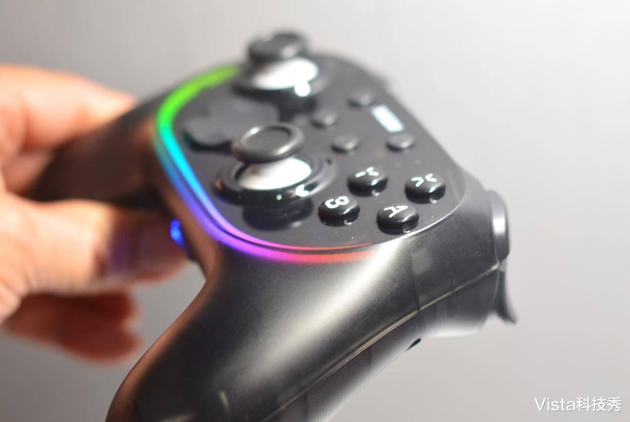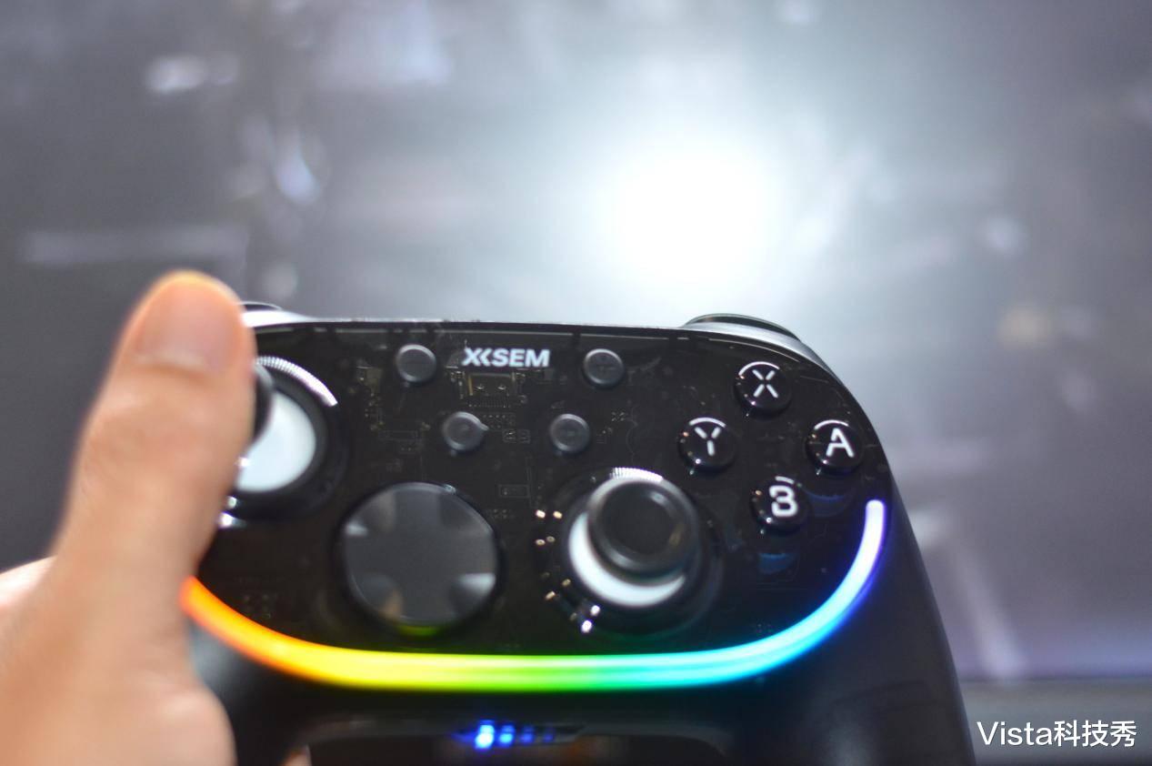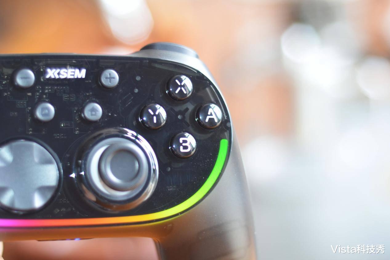 这里还得夸一下西圣GC1的 RGB 炫酷光效,手柄上内置RGB炫酷氛围灯带,通过手柄背后的调节键,可设置炫彩流光、摇杆互动、扳机互动、ABXY互动、随机炫彩、流光、呼吸、常亮等 10 种可调模式,调节到与游戏相搭配的模式,就可以体验光影与按键、震动、节奏同步的专属电竞氛围,特别是夜间模糊的灯光下,炫彩的灯效更有酷炫的感受。