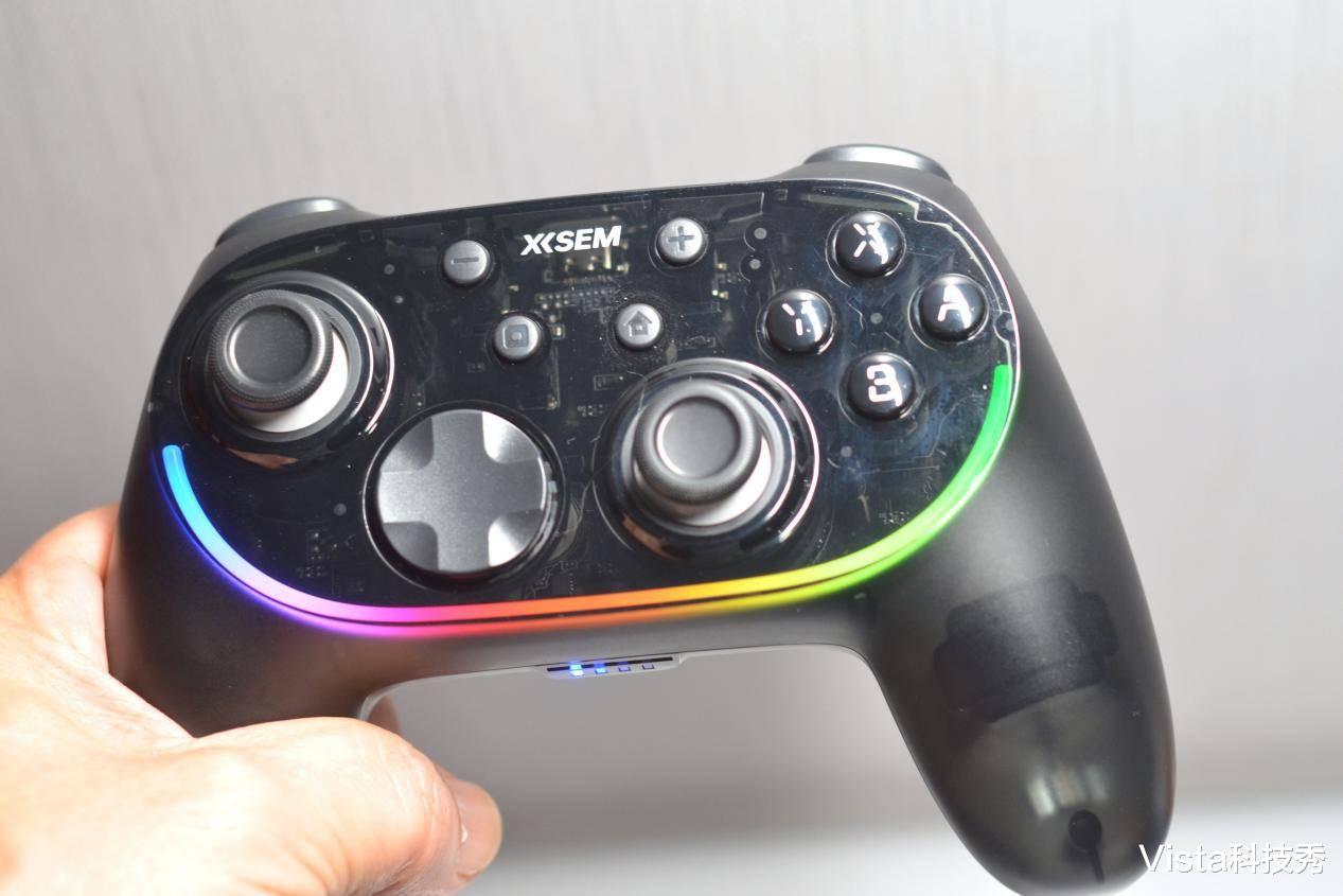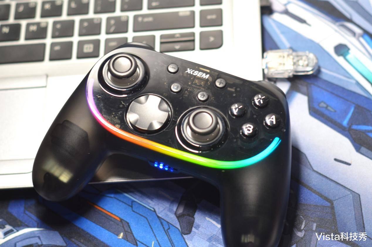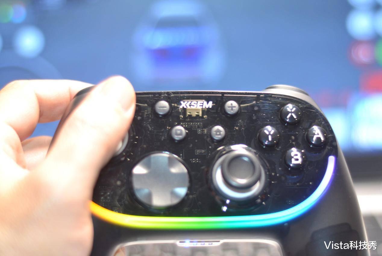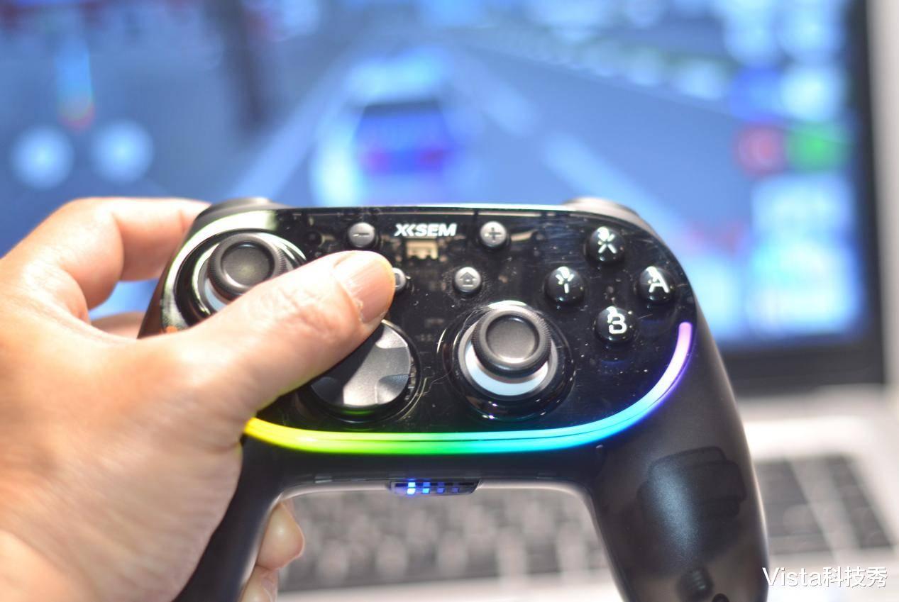 这里还得夸一下西圣GC1的 RGB 炫酷光效,手柄上内置RGB炫酷氛围灯带,通过手柄背后的调节键,可设置炫彩流光、摇杆互动、扳机互动、ABXY互动、随机炫彩、流光、呼吸、常亮等 10 种可调模式,调节到与游戏相搭配的模式,就可以体验光影与按键、震动、节奏同步的专属电竞氛围,特别是夜间模糊的灯光下,炫彩的灯效更有酷炫的感受。