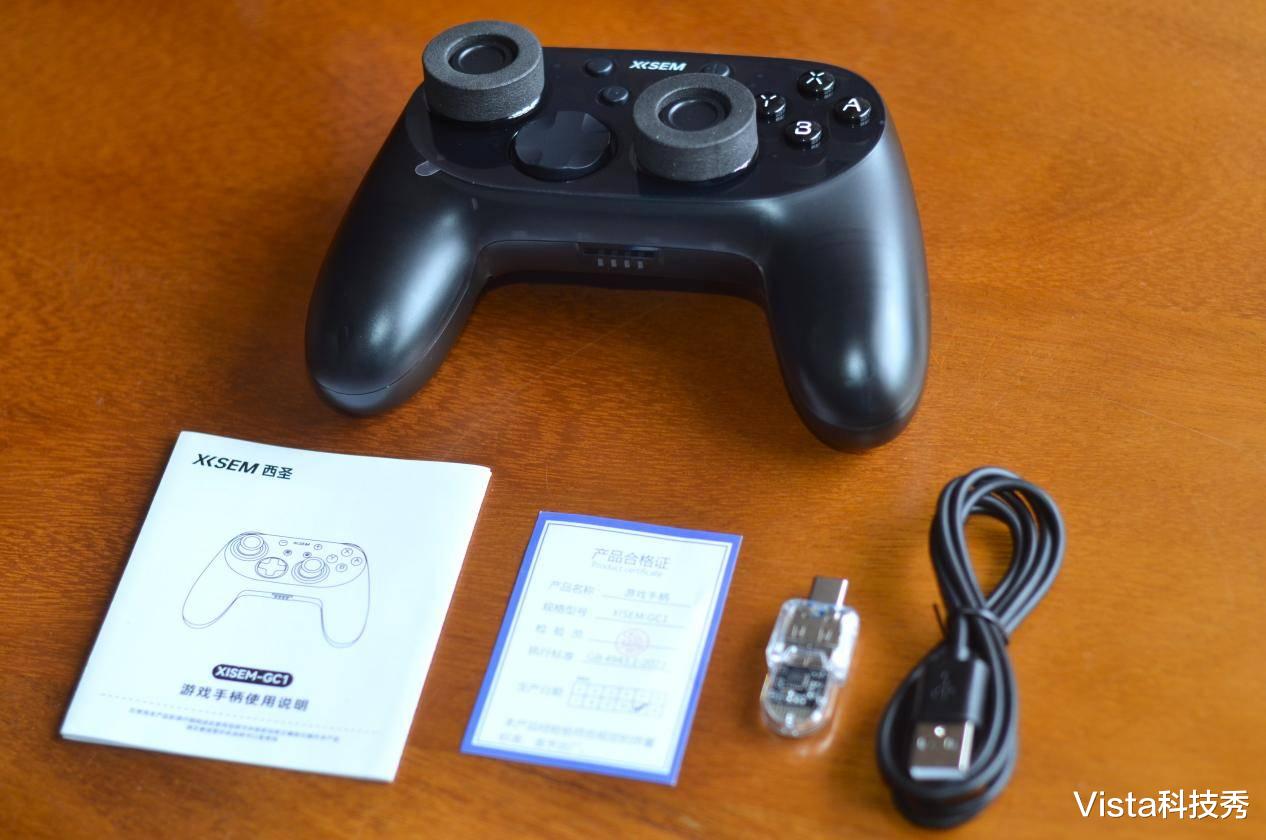 西圣GC1配件包括手柄主体,另有使用说明、产品合格证、2.4G接收器和TYPE-C连接线,简洁不简约。