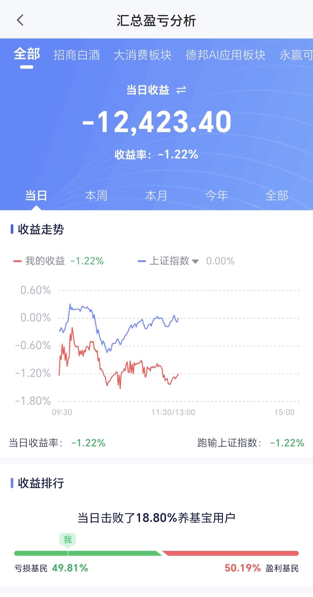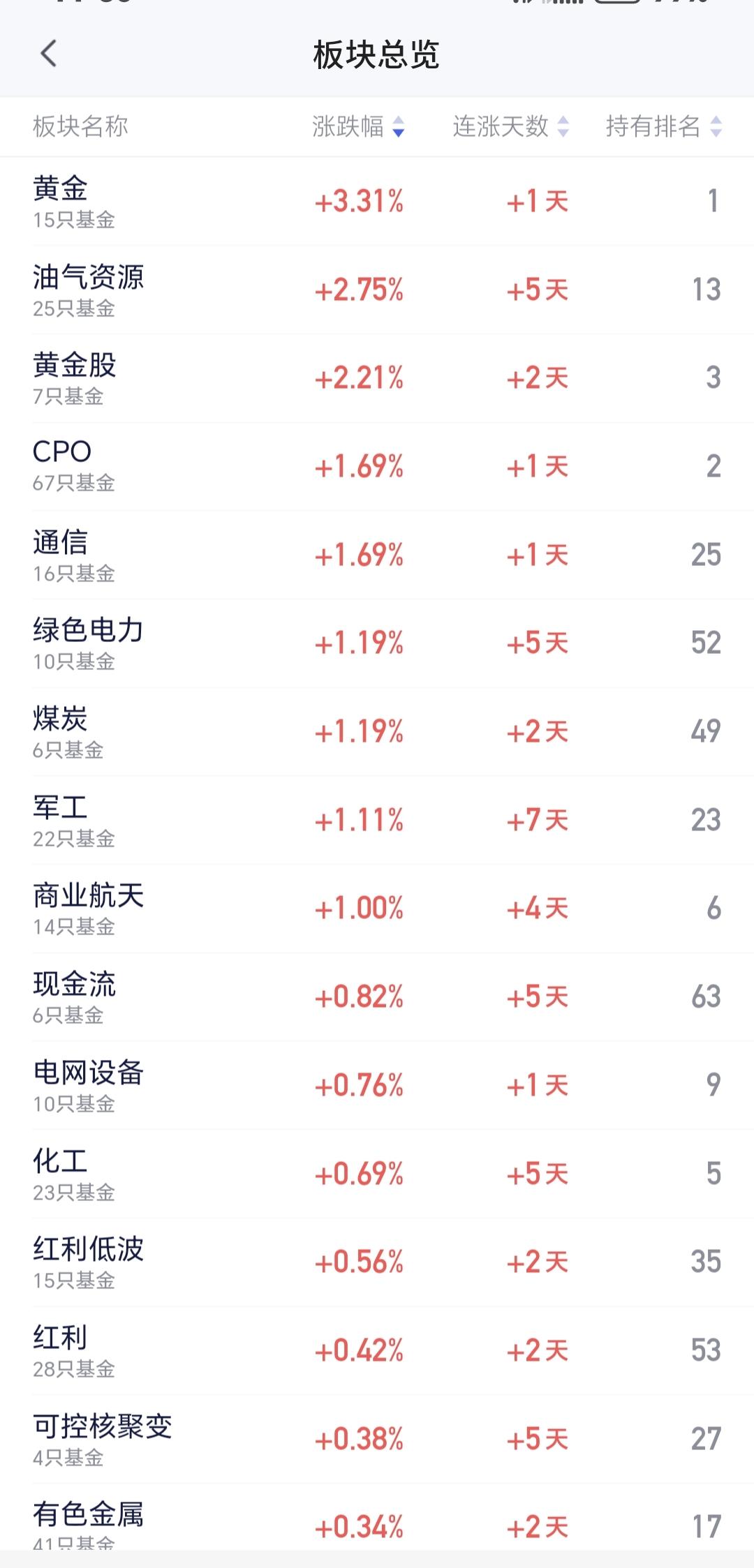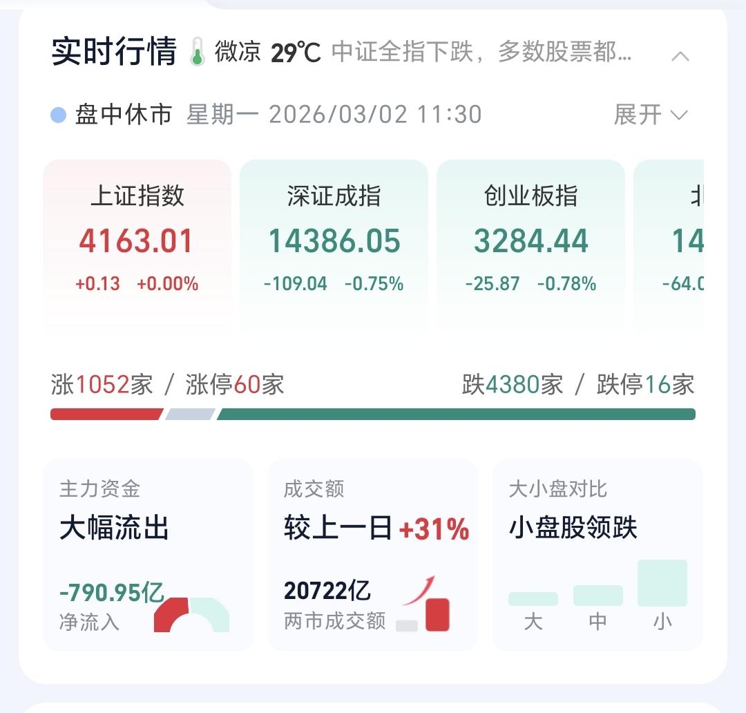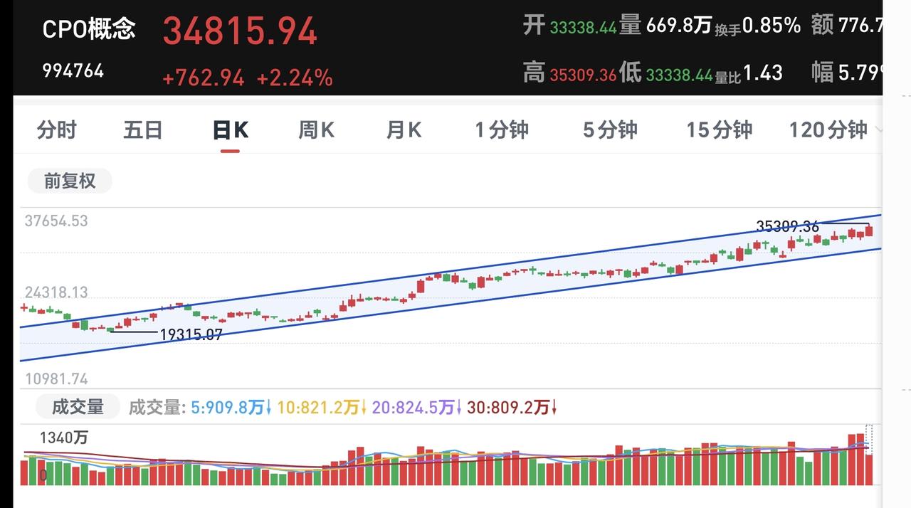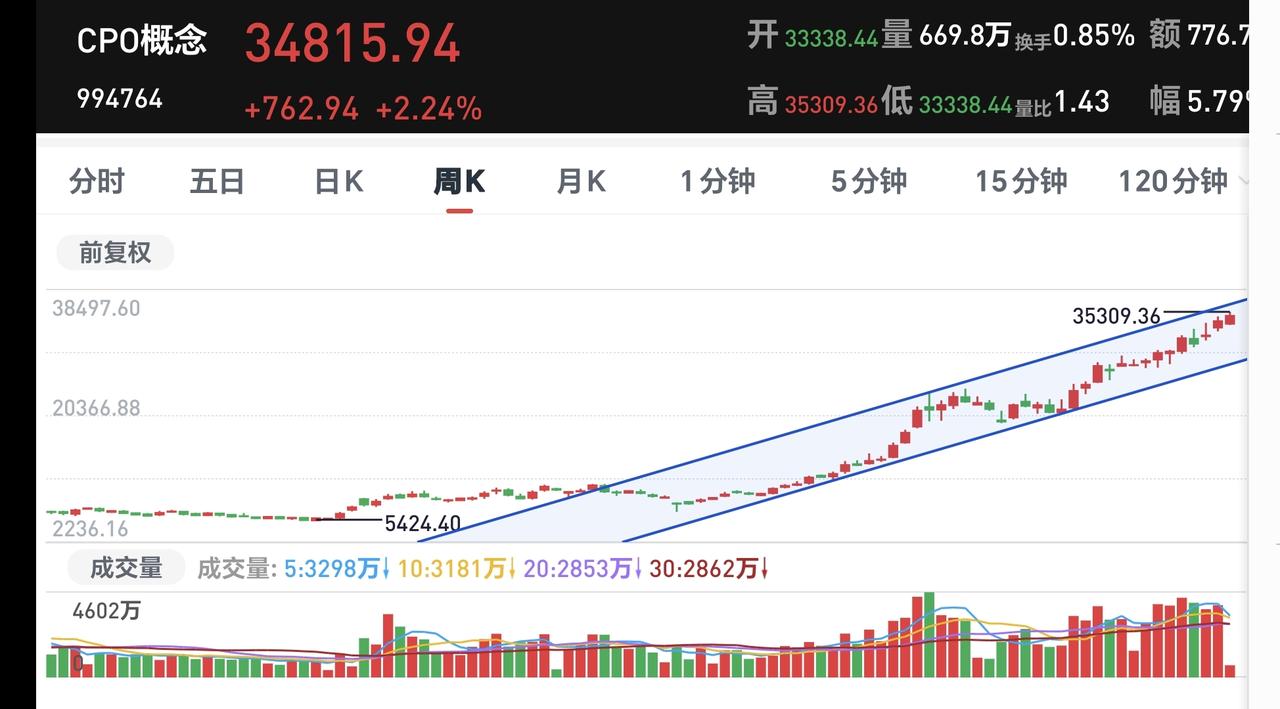 基金:Cpo板块大涨,能不能继续持有 今天市场受外围消息的影响低开,但低开的幅度比想象中要小很多,整个上午是一个探底回升的过程,中午收盘的时候,创业板指下跌了0.78%,收于3284点,上证指数收的是一个平盘,收盘点位4163点。 整个股票市场,上涨1052家,下跌4380家,涨停60家,跌停16家,上涨家数少于下跌家数。 持有的基金中,中午收盘的时候,估值盈利金额最大的三个板块是:5G板块,军工板块,可控核聚变板块,估值亏损金额最大的三个板块是:创新药板块,芯片半导体板块,证券板块,估值整体亏损了12423元。 整个基金市场,上涨9036家,下跌16360家,上涨幅度超过5%的19家,下跌幅度超过5%的2家。 图10是今天板块的上涨排行榜,上涨幅度最大的三个板块是:黄金板块,油气资源板块,cpo板块,图11是今天板块的下跌排行榜,下跌幅度最大的三个板块是:北证板块,恒生科技板块,交通运输板块,图12是今天基金的加仓和减仓人数,加仓1561378人,减仓598000人,加仓人数超过了减仓人数。 整个市场主力资金净流入最多的三个板块是:通信设备板块,通信板块,军工板块,主力资金净流出最多的三个板块是:国企板块,蓝筹策略板块,人工智能板块。 1:今天黄色线在蓝色线的下方,两条线之间的敞口比较大,这样的情况下不支持下午有继续大幅度的反弹。 2:上午收盘的时候五天线位置是4147点,收盘点位4163点,收在五天线之上,只要是能够保持在五天线之上震荡,就不要过分担心盘面的走势。 3:今天上午,两市累计成交20722亿,相比于上周五同期放量了31%,这是一个比较大的放量幅度,说明有许多资金在上午逃出了市场。 4:Cpo板块今天是上涨的,中午收盘的时候上涨了1.69%,持有人数在所有板块当中排名第二位。 Cpo板块日线级别处于上涨通道中,只要能够保持住这样的上涨趋势,短线持有的人就可以继续持有,日线级别上涨通道的下轨线是短线持有人的持有条件,只要不跌破这个上涨通道的下轨线,就可以继续持有。 Cpo板块周线级别也是处于上涨通道中,距离上涨通道的上轨线更近一些,不建议在这样的位置追涨进场,周线级别上涨通道的下轨线是长线持有者的持有条件,只要不跌破周线级别上涨通道的下轨线,长线持有的人都可以继续持有。 今天上午上证指数能够以平盘收盘,完全是某种力量的功劳,但外围消息面的变化还会很大,如果能很结束这个冲突,市场再创新高的可能性很大,但如果冲突进入胶着状态,后面还会有一个下跌的过程,我们只要喝茶看戏,按照既定的操作策略来办,往上和向下,我们都有应对的策略,向上我们有再一次止盈的筹码,向下我们有捞回前段时间止盈筹码的现金,所以,不管市场是往上走还是向下走,好像对我们都是有利的。 这个时候我们需要有一个战略定力,不可轻易主观臆断外围局势,我们需要等待尘埃落定,我们需要等待市场给予我们的机会,这样的机会,我们自己并不能创造,这样的机会,我们只能是耐心等待。 花1秒钟点赞,花30秒钟评论,就是对我最大的支持,谢谢大家的支持。