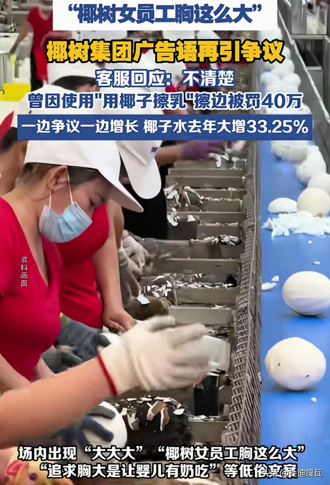 椰树集团的广告语又惹争议了, “大大大”,“椰树女员工胸这么大”,“追求胸大是让婴儿有奶吃”等这些广告语都挂在椰树集团对外开放的工厂里。 有网友说,只要不是在电视上,杂志上大肆的宣传,涉及面比较窄就没有任何问题。 但也有人认为,就算是张贴在工厂内,这也是对女性员工的不尊重。 这也不是椰树广告语第一次发生争议,之所以如此的雷人还屡教不改,是因为增长的销量比起罚单要大得多,商家这笔账还是会算的。
