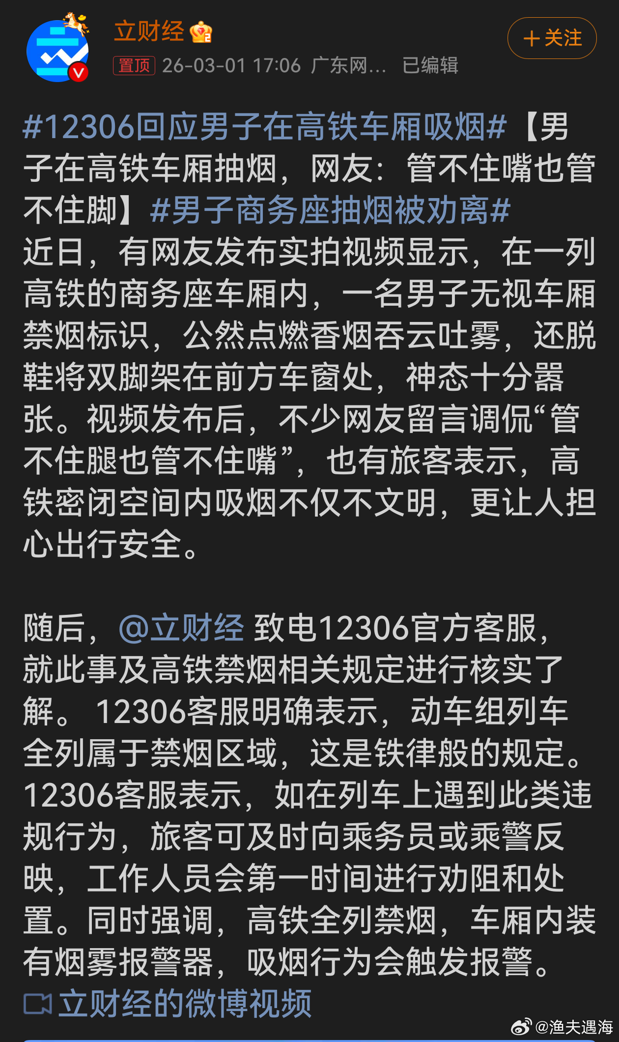12306回应男子在高铁车厢吸烟男子在高铁商务座抽烟、脱鞋,如此嚣张行径实在恶劣。高铁全列禁烟是铁律,关乎公共安全与文明秩序。这种无视规则的行为不能被容忍,旅客应积极监督举报,铁路部门也需严格执法,以维护每一位乘客的安全与舒适出行环境。