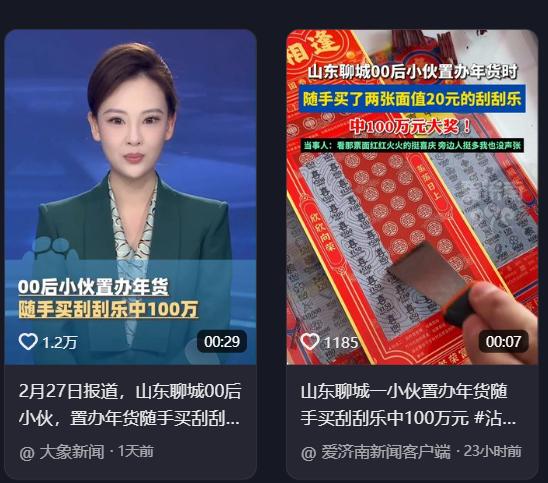 “这运气绝了!”近日,山东聊城,一小伙春节前去置办年货时,随手买了两张20元的刮