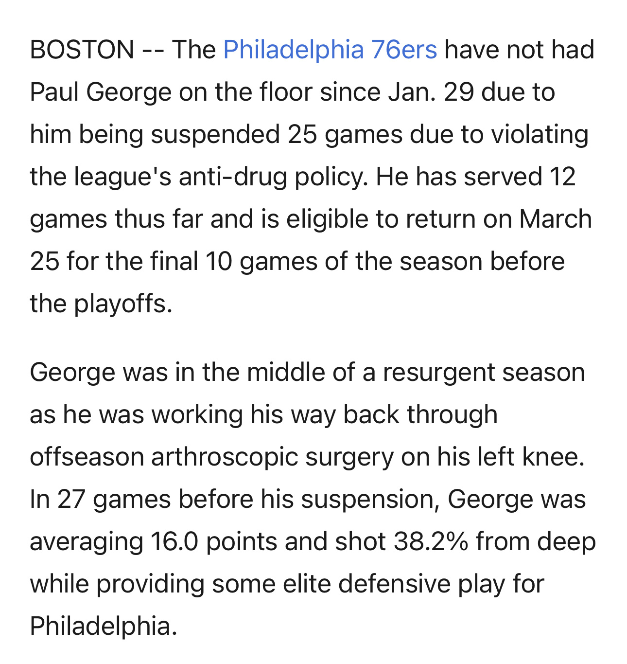 由于违反联盟禁药规定被处以25场禁赛,费城76人队自(北京时间)1月30日以来便一直缺少保罗·乔治的身影。截至目前,他已经执行了12场禁赛,有资格在(北京时间)3月26日复出,赶在季后赛前参加常规赛最后10场比赛。