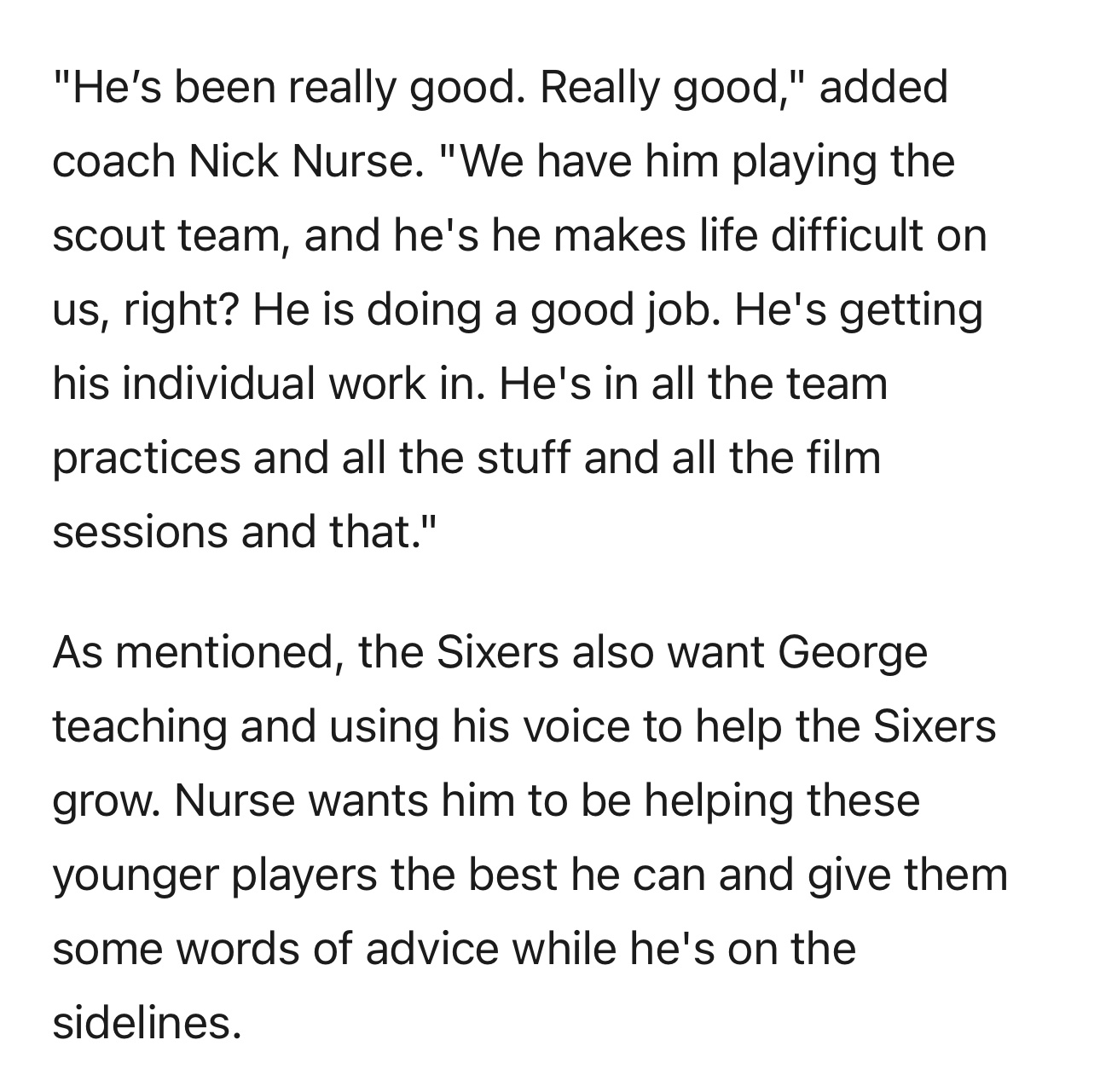 如前所述,76人队也希望乔治能言传身教,用自己的声音帮助球队成长。纳斯希望他能尽可能地帮助这些年轻球员,在他坐在场边的时候,给他们一些建议。