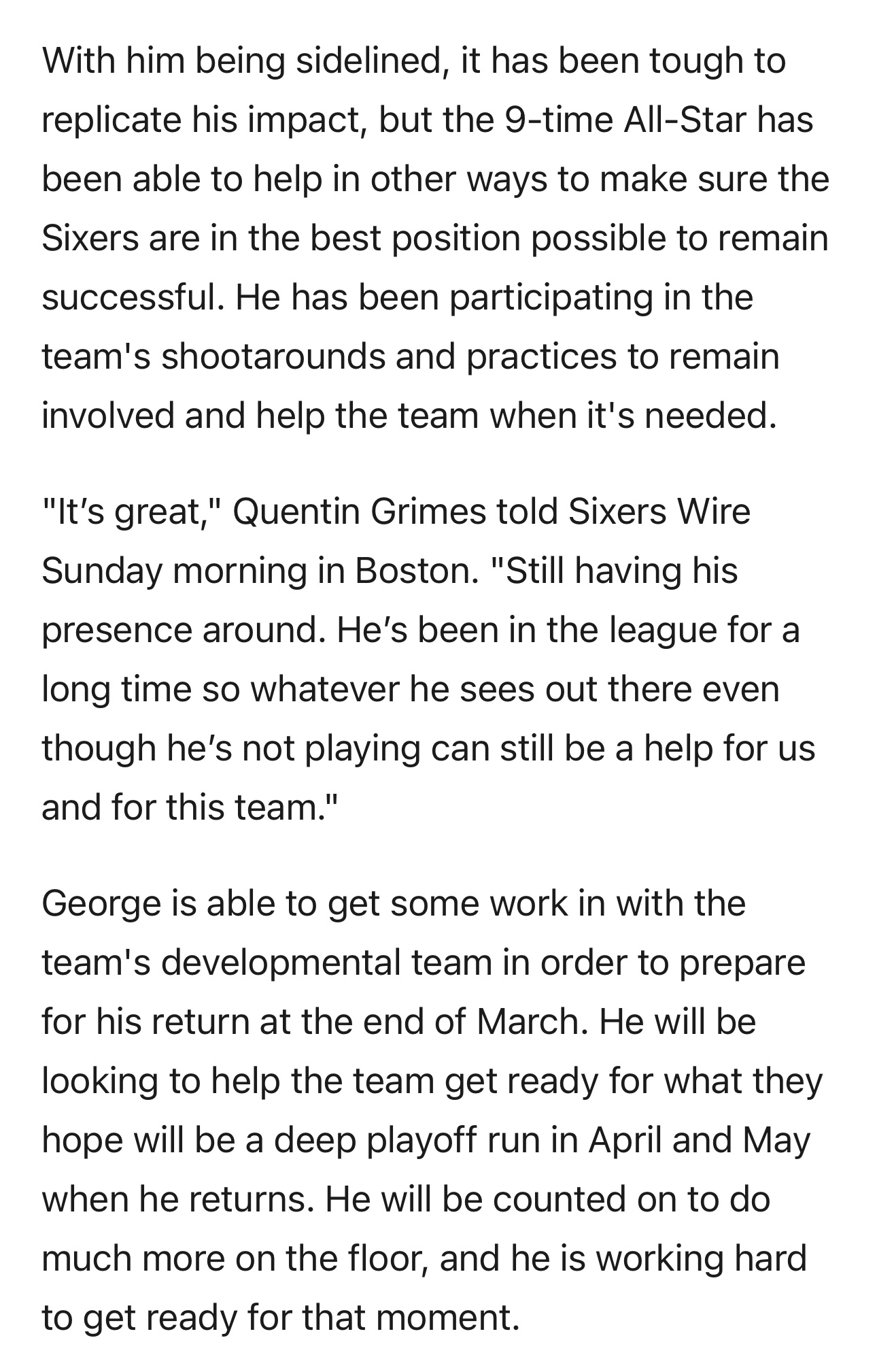 乔治的缺阵使得球队很难有人能替代他的作用,但这位9次入选全明星的球员一直通过其他方式为球队提供帮助,确保球队尽可能地保持竞争力,为取得成功创造最好的条件。他一直参加球队的赛前投篮训练和常规训练,以保持参与感,并在需要时为球队提供帮助。