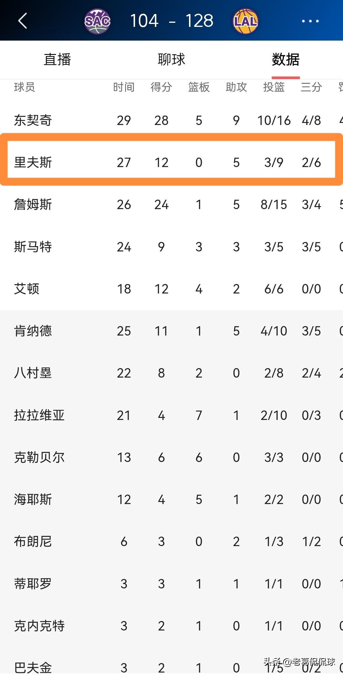 湖人超级球星里弗斯终于躺赢了一回!在今天湖人主场以128:104大胜国王的比赛中,里弗斯好好的体验了一把躺赢的感觉。 全场比赛下来,里弗斯首发出战27分钟,投篮9中3,其中三分球6中2、罚球4中4仅仅得到12分,他的场上正负值为+15。 老实说,由于国王的整体实力过于羸弱,因此里弗斯在进攻端完全提不起兴趣,我觉得本场比赛里弗斯甚至都没有怎么出汗。