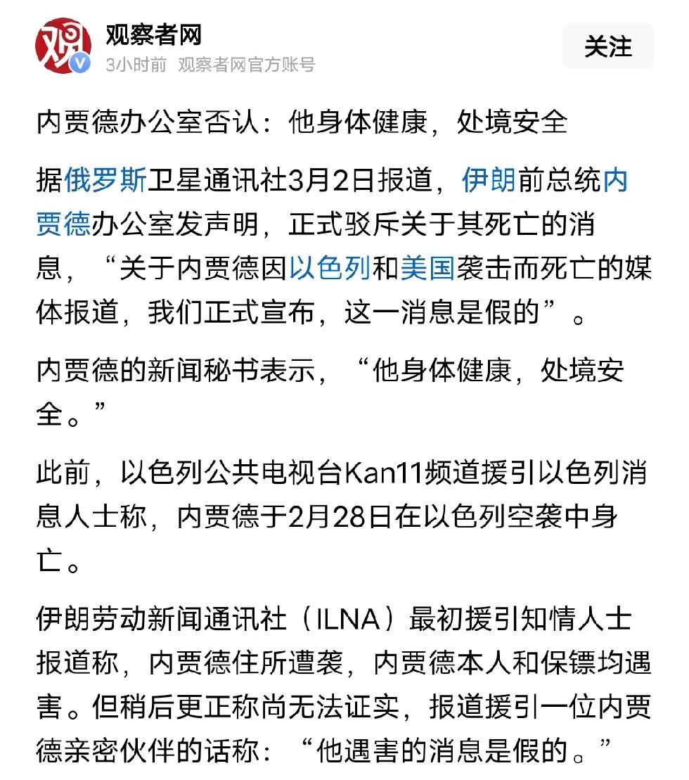昨天,包括诸多权威大媒体在内,皆援引“外媒”消息宣称,伊朗前总统内贾德遭遇袭击身亡,描述得绘声绘色,甚至连保镖也一同殒命。百科更是迅速更新了内贾德的生辰与死亡信息。 然而一夜之间,内贾德办公室发表声明称“他身体健康,处境安全”。那些昨天还将内贾德死亡消息视作最有价值新闻,或许还因此得到鼓励、奖励的媒体,如今剧情突然反转。百科赶忙删除了内贾德的去世信息,甚至连出生日期都一并删去。 在这个流量至上的时代,倘若连央媒都随波逐流,那可就太可怕了。新闻沦为娱乐,而且娱乐的竟是自己,可笑不可笑!