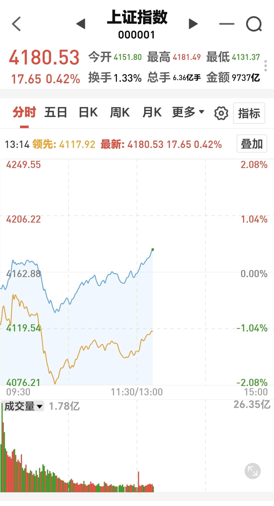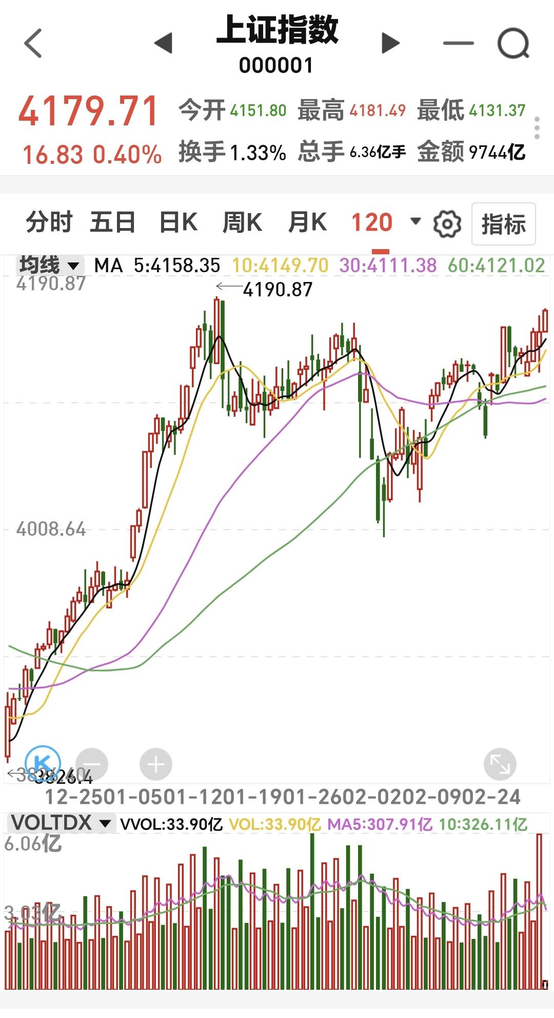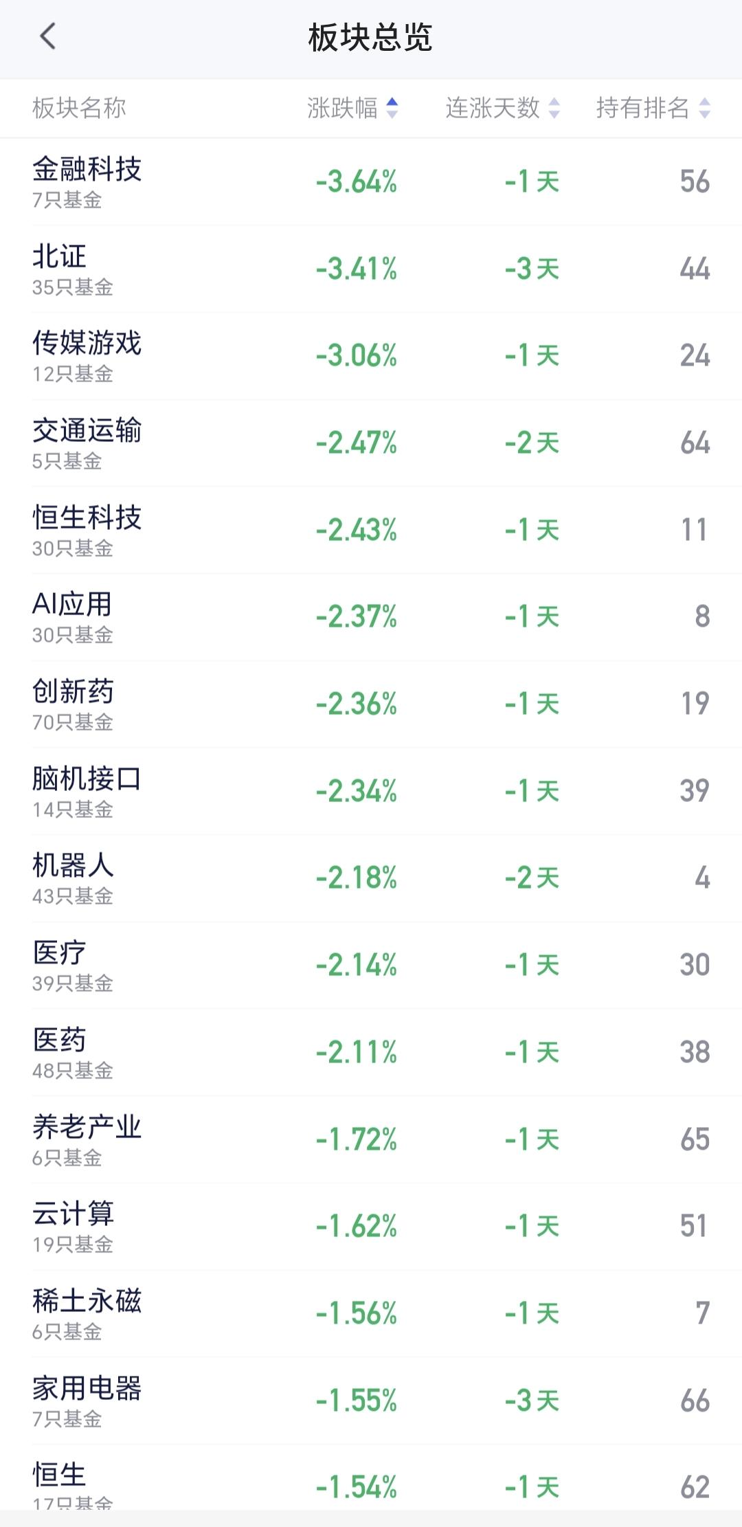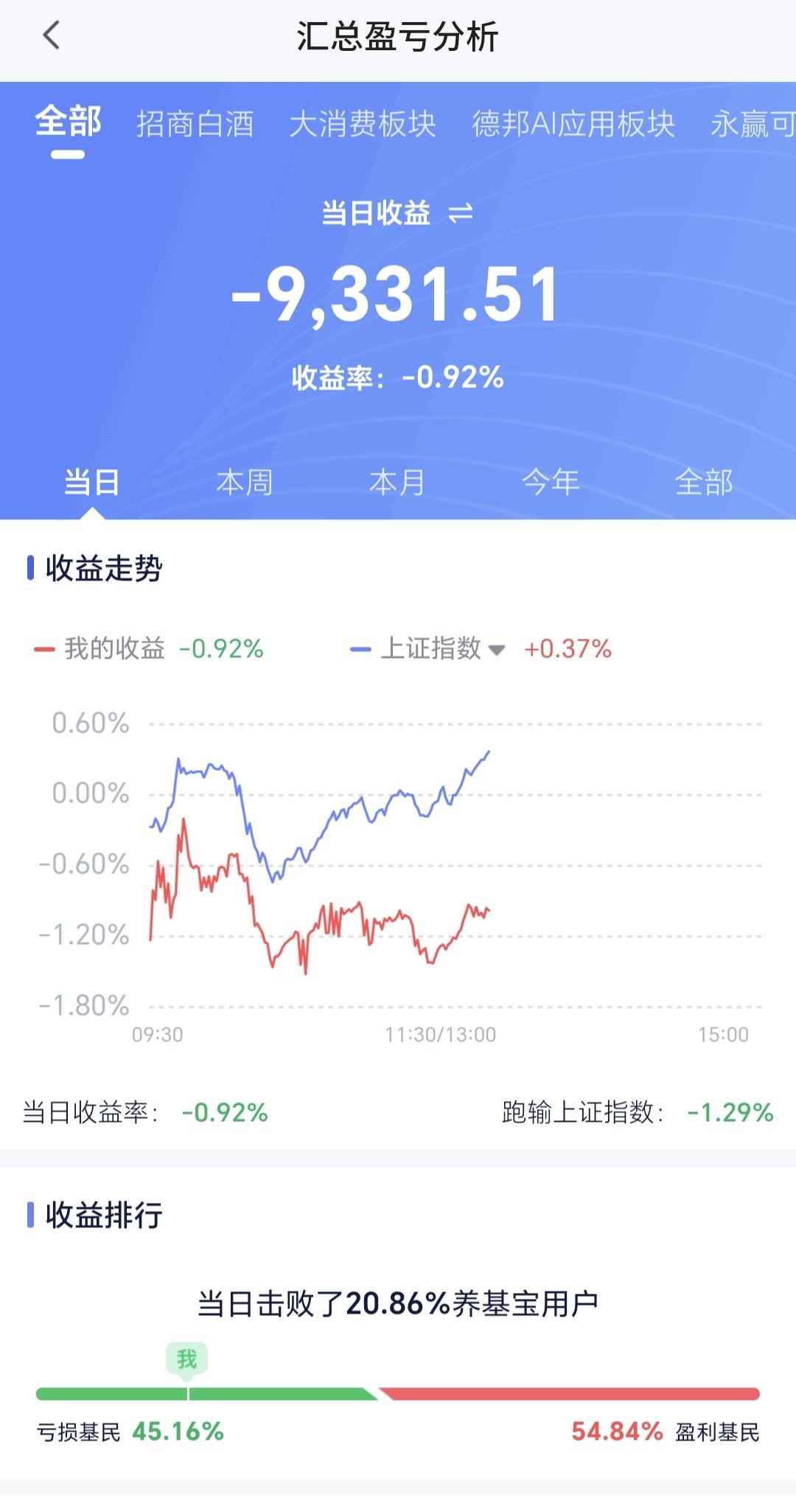 基金:创新药板块和稀土永磁板块 下午开盘以后,指数震荡向上,上证指数已经翻红,创业板指和深成指的下跌幅度也已经缩小,创业板指下跌了0.30%,盘中点位3300点,上证指数上涨了0.42%,盘中点位4180点,距离前高4190点,只有10个点的空间。 整个股票市场,上涨1165家,下跌4268家,涨停67家,跌停18家,上涨家数少于下跌家数。 持有的基金中,盘中估值盈利金额最大的三个板块是:5G板块,军工板块,上证50板块,估值亏损金额最大的三个板块是:创新药板块,芯片半导体板块,证券板块,估值整体亏损了9331元。 整个基金市场,上涨10860家,下跌8752家,上涨幅度超过5%的19家,下跌幅度超过5%的2家。 图10是今天板块的上涨排行榜,上涨幅度最大的三个板块是:黄金板块,油气资源板块,煤炭板块,图11是今天板块的下跌排行榜,下跌幅度最大的三个板块是:金融科技板块,北证板块,传媒游戏板块,图12是今天基金的加仓和减仓人数,加仓11998870人,减仓3826004人,加仓人数超过了减仓人数。 整个市场主力资金净流入最多的三个板块是:通信设备板块,通信板块,5G板块,主力资金净流出最多的三个板块是:国企板块,蓝筹策略板块,人工智能板块。 1:今天下午虽然是震荡向上,但黄色线还是在蓝色线下方,今天如果盘中创4190点新高,如果收盘点位在4190点上方,从明天开始,随时随地准备再一次止盈。 2:现在两市累计成交21959亿,相比于上周五放量了29%,全天的成交量预计在30000亿左右,以这样的成交量再创新高,即使冲上去了,也很难站稳。 3:创新药板块今天大跌,现在盘中下跌跌破了日线级别上涨通道的下轨线,而且形成了一个新的日线级别短期下跌通道,短线想进场的人耐心等待上涨突破日线级别短期下跌通道的上轨线,上涨突破了日线级别短期下跌通道上轨线以后,再考虑要不要进场。 创新药板块周线级别今天也跌破了上涨通道的下轨线,长线的人现在也应该选择观望,长线想进场的人也是要盯住日线级别新的下跌通道,上涨突破日线级别下跌通道上轨线的时候再考虑要不要进场。 4:稀土永磁板块今天也是下跌,上周五上涨到达了日线级别上涨通道的上轨线附近,我当时说,凡是上涨通道上轨线附近进场都需要谨慎,前几次上涨到上轨线附近也都是回落的,今天也是回落的走势,但今天的下跌并没有改变这个板块日线级别的上涨趋势,短线持有的人可以继续持有。 稀土永磁板块周线级别也是处于上涨通道中,距离上涨通道的下轨线比较远,小幅度的下跌都改变不了这个板块周线级别的上涨趋势,长线持有的人可以继续持有,除非下跌跌破这个周线级别上涨通道的下轨线,才可以考虑要不要止盈出来观望。 在外围局势不确定的情况之下,市场越是往上涨越是要谨慎,而且今天是生拉硬拽上去的上涨,现在上证指数虽然是红盘,但我持有的基金却是大幅度亏损,现在的持有亏损金额在10000块钱左右,这就是表面风光,我们不需要这样的上涨,这样的上涨也不会持久,今天究竟应该怎么办?我会在评论区留言。 花1秒钟点赞,花30秒钟评论,就是对我最大的支持,谢谢大家的支持。