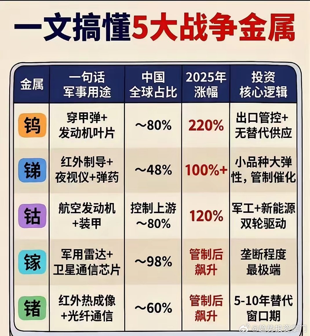 五大战争金属核心解析大国博弈下,钨、镍、铝、锌、钯战略价值凸显。钨(W)中国占全球约80%供应,军工与高端制造核心原料。龙头:厦门钨业、中钨高新。镍、铝、锌、钯俄罗斯储量与出口占比极高,俄乌冲突引发供给紧张:- 镍:高镍电池关键原料- 铝、锌:冲突后供给收紧- 钯:半导体核心材料,俄占全球45.6%供应量稀缺性与不可替代性强,战略价值突出。