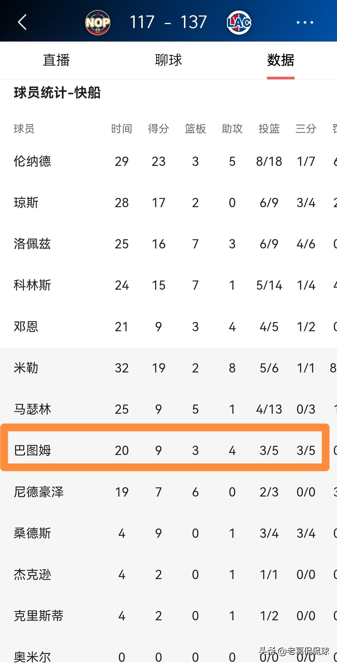 快船老将巴图姆真是太让人惊喜了!在今天快船主场以137:117轻取鹈鹕的比赛中,37岁的巴图姆仿佛梦回巅峰一样打出了非常全面的表现。 整场比赛下来,巴图姆替补出战20分钟,三分球5中3非常高效的砍下9分,还有3篮板4助攻,他的场上正负值为+5。 众所周知,巴图姆在巅峰时期享有“法国皮蓬”的美誉,而今天巴图姆再次让人们领略到了他巅峰时期的风采。